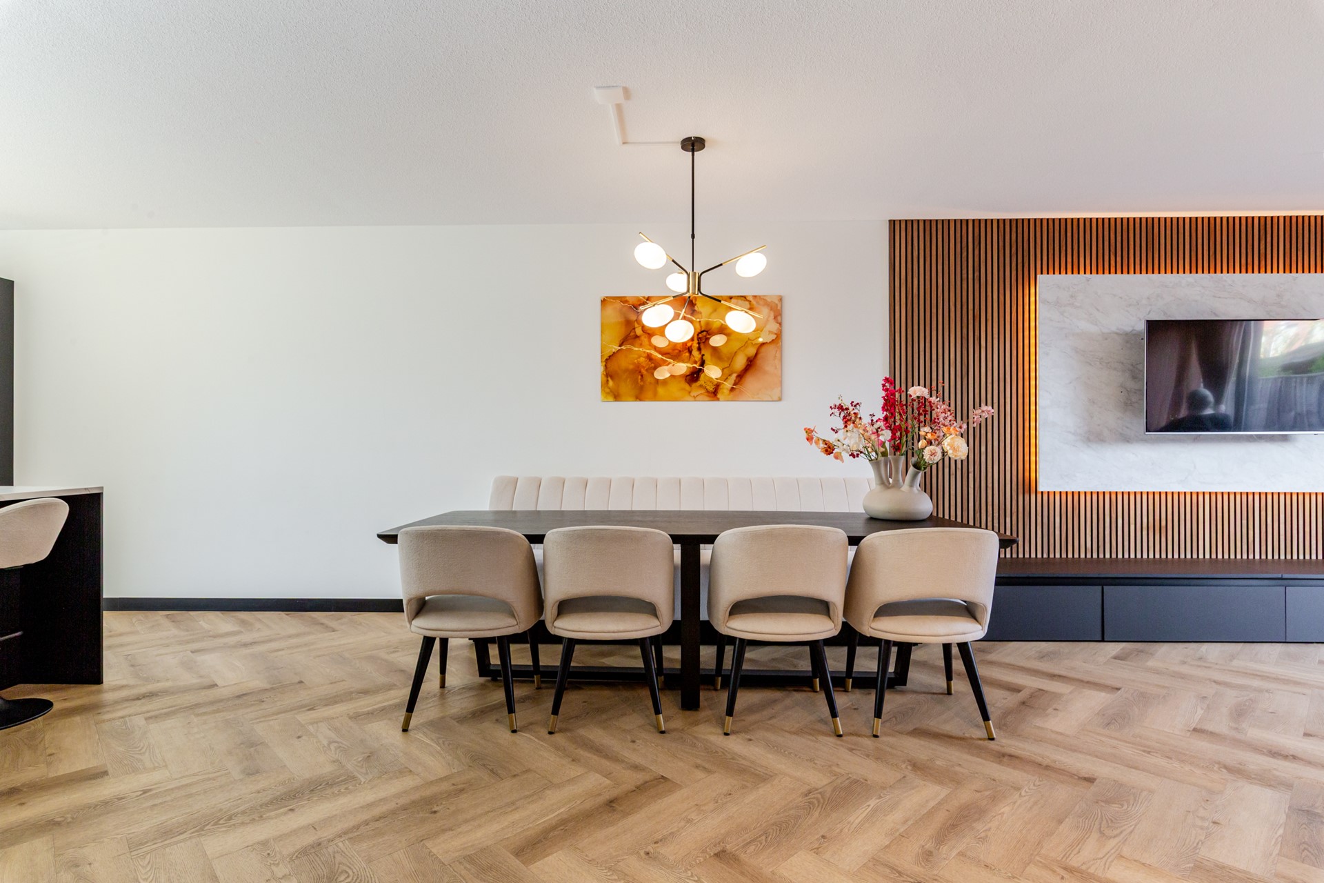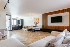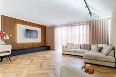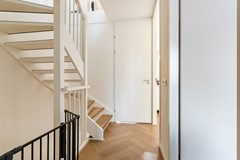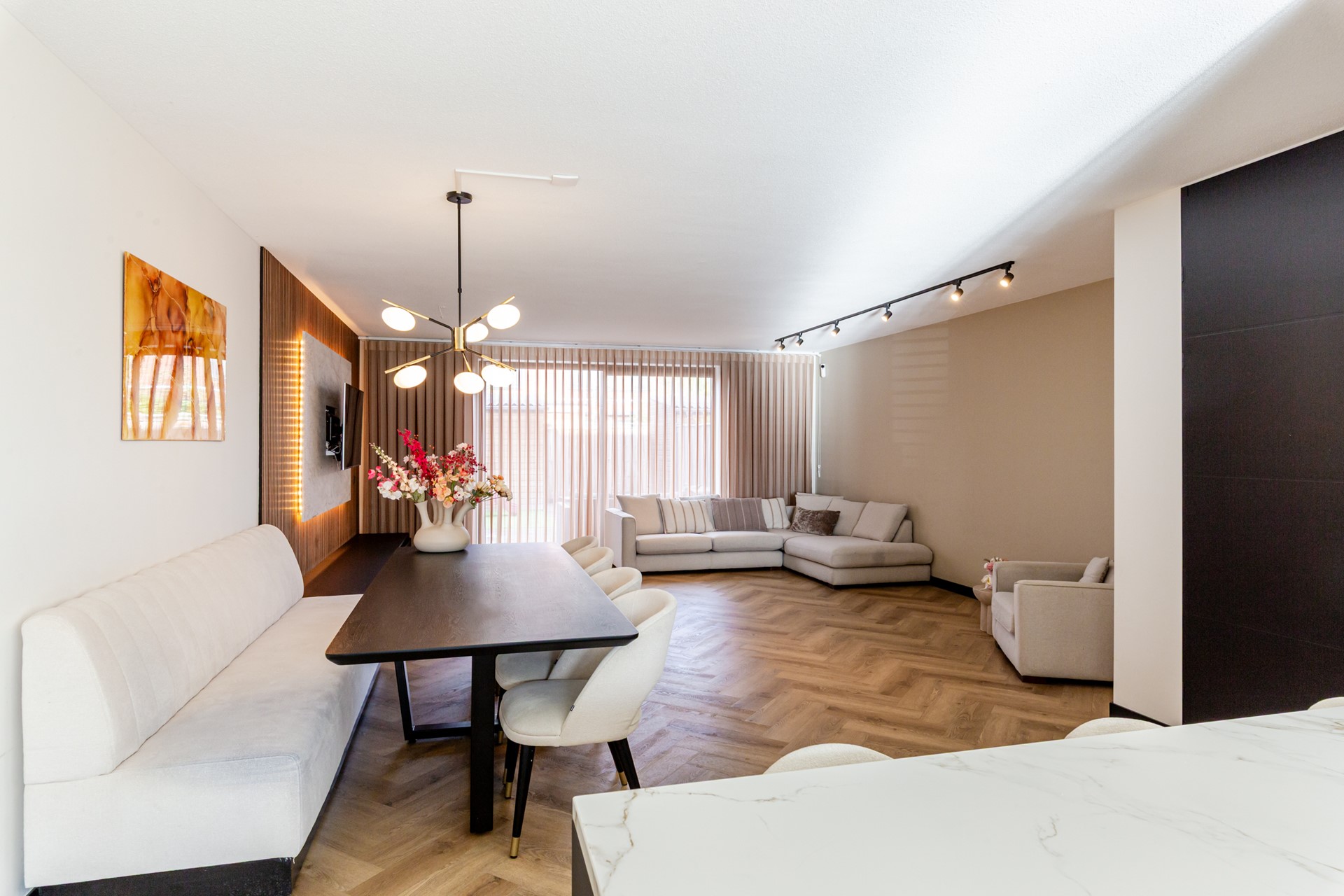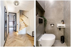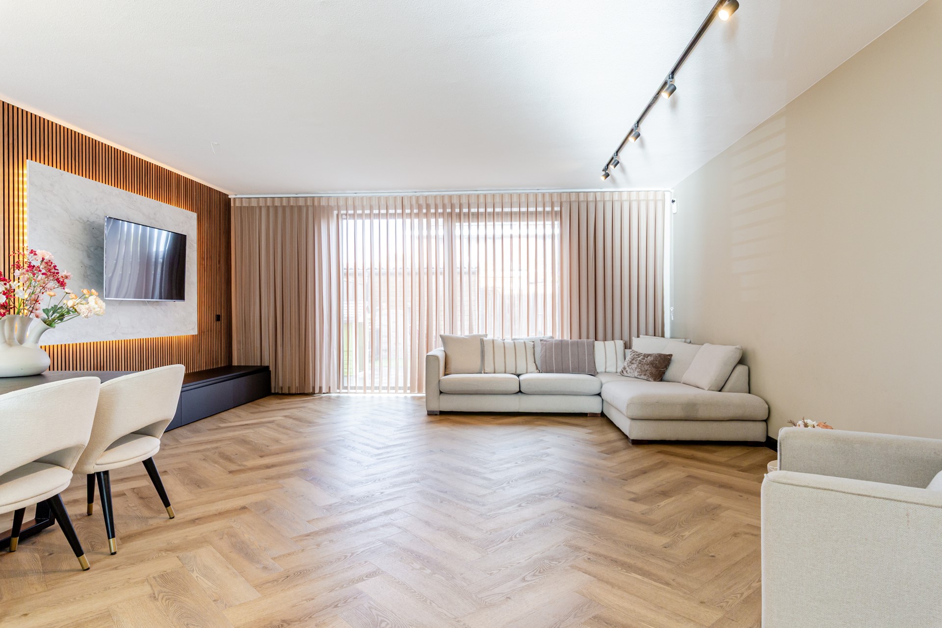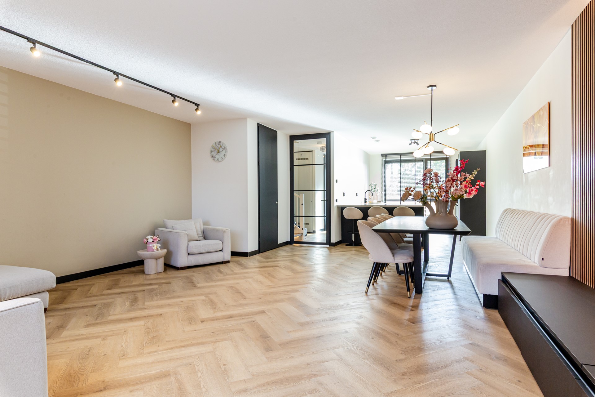 Al bij aankomst valt de verzorgde voortuin op. Je hebt hier een prettig vrij uitzicht over de rustige, groene straat. Via de voordeur kom je binnen in de nette hal, waar zich het toilet bevindt, de trapopgang naar de eerste verdieping en de deur naar de woonkamer. Zodra je de woonkamer binnenstapt, merk je het direct: dit huis is met zorg en smaak afgewerkt. De kleurkeuzes zijn modern en tijdloos, de wanden strak gestuct en de zwarte plinten en deurkozijnen geven het geheel een eigentijdse uitstraling. De visgraat vloer met vloerverwarming loopt drempelloos door en zorgt voor rust en een gevoel van luxe.