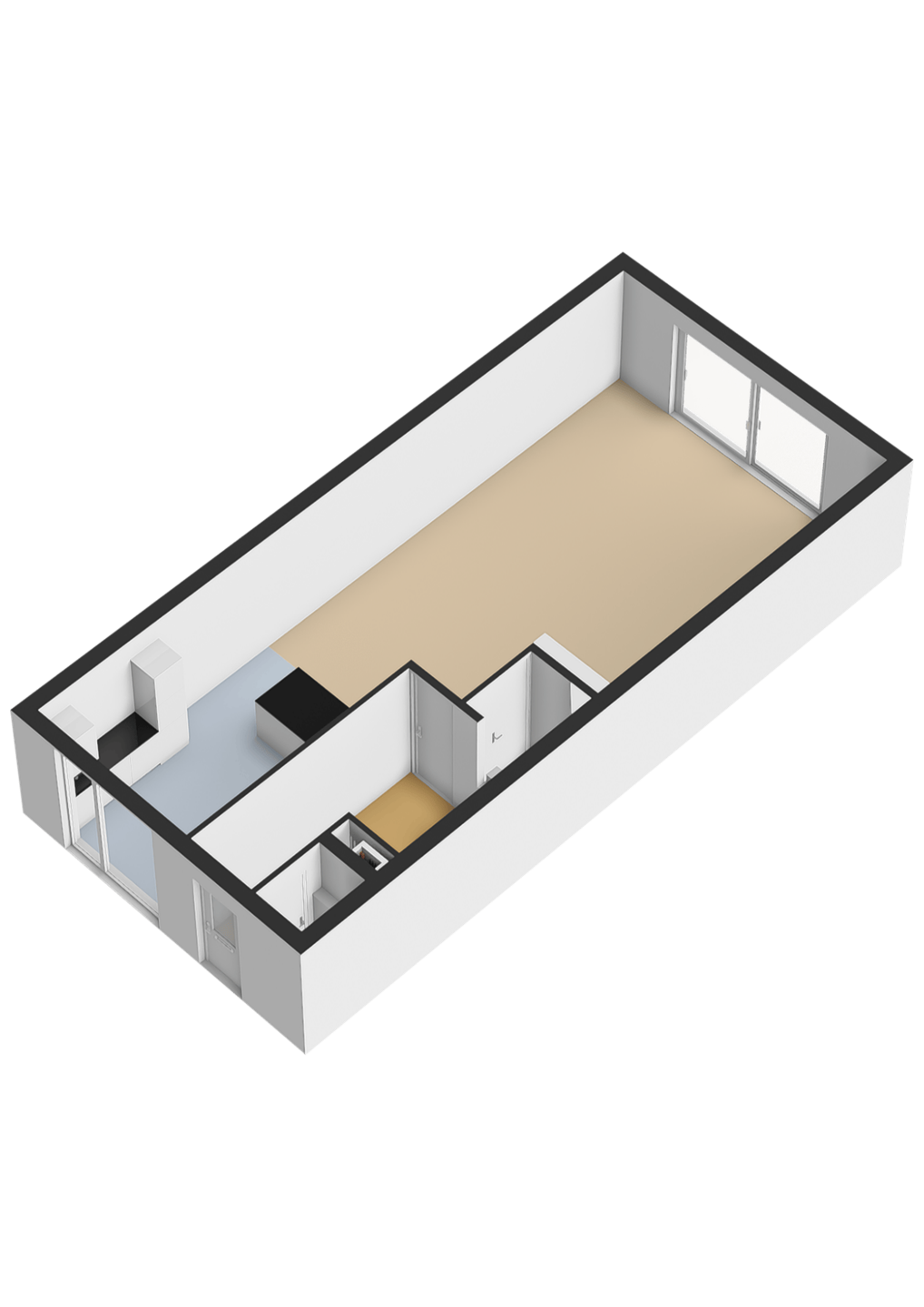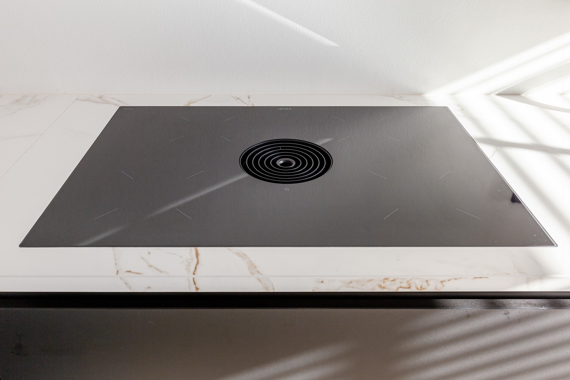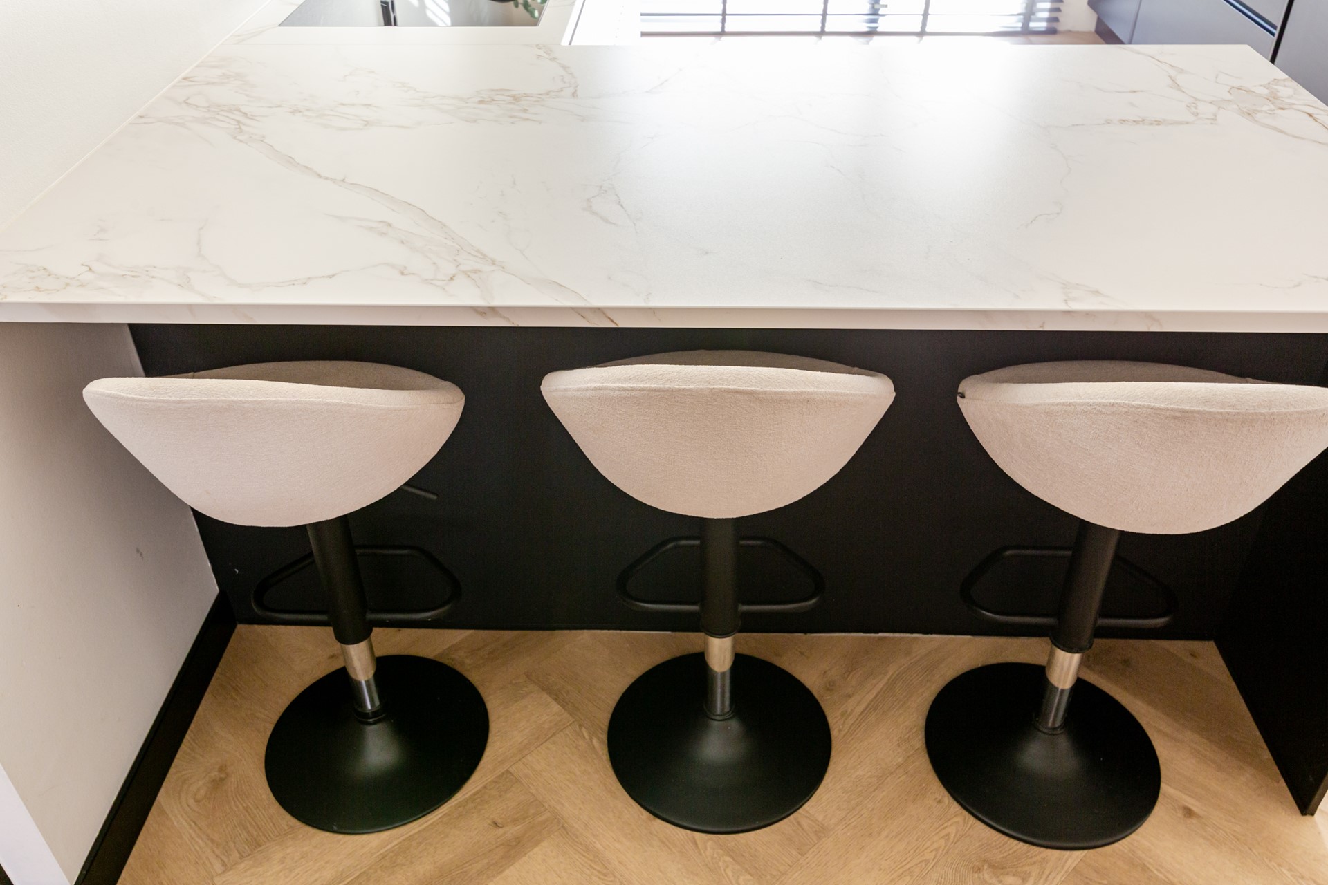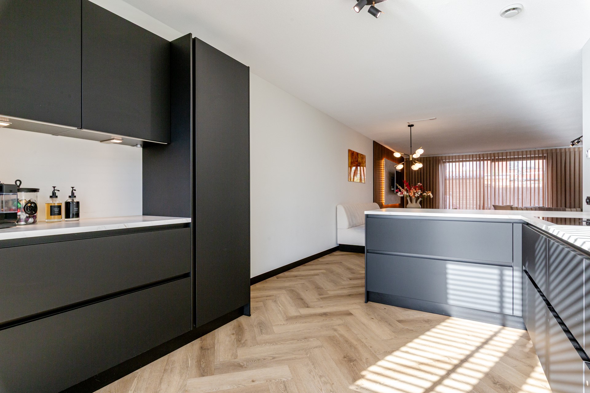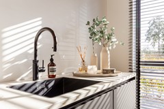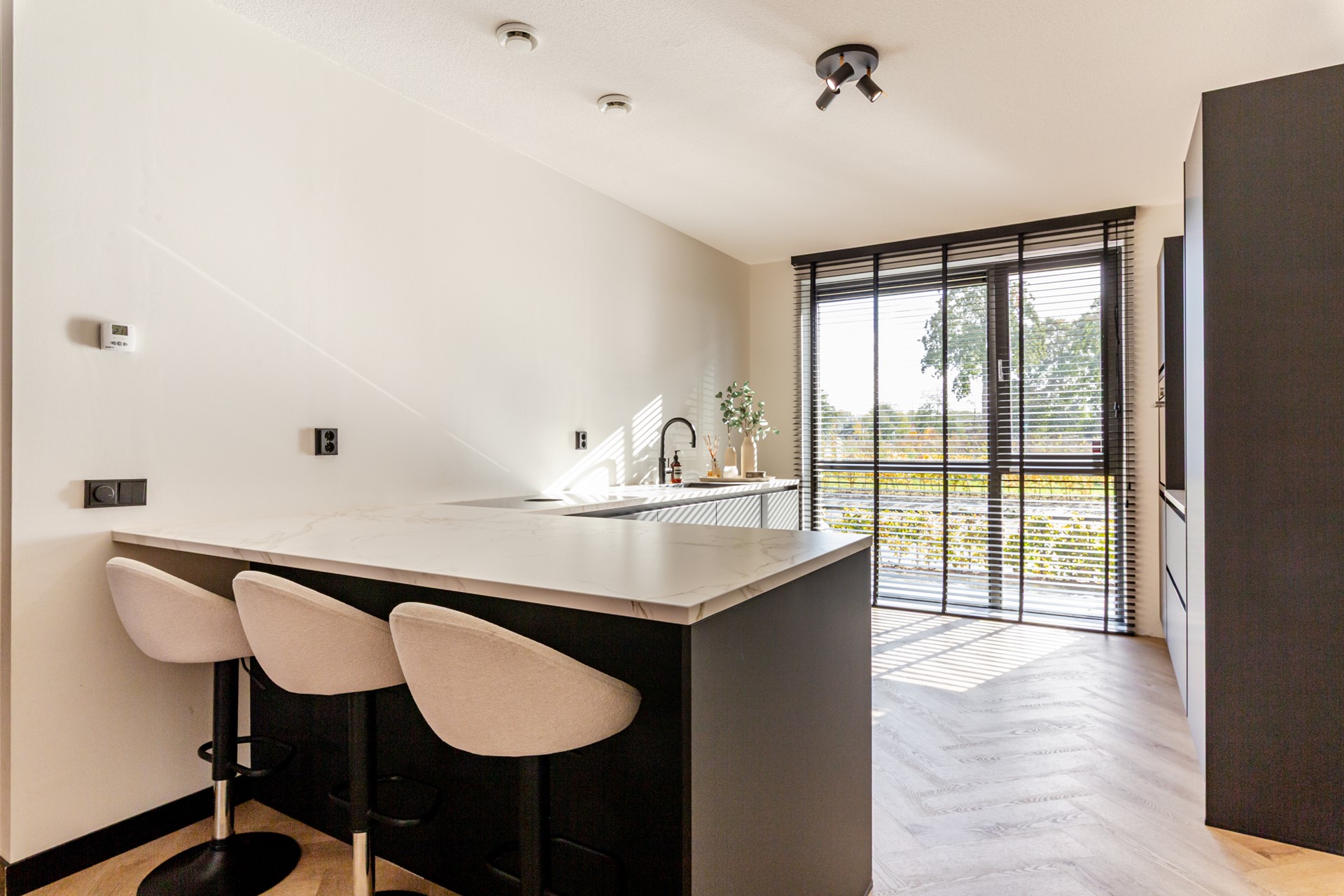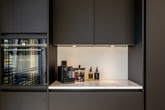 Aan de voorzijde van de woning ligt de keuken, uitgevoerd in een L-opstelling. Hier is duidelijk aandacht besteed aan zowel stijl als functionaliteit. De keuken beschikt over veel opbergruimte met handige lades, een Quooker heetwaterkraan en spoelbak, en een hoogwaardige Bora inductiekookplaat met geïntegreerde afzuiging. Aan de andere zijde van de keuken is een los element geplaatst, dat nu als koffiehoek wordt gebruikt, met daaronder nog extra kastruimte en plek voor de koelkast.