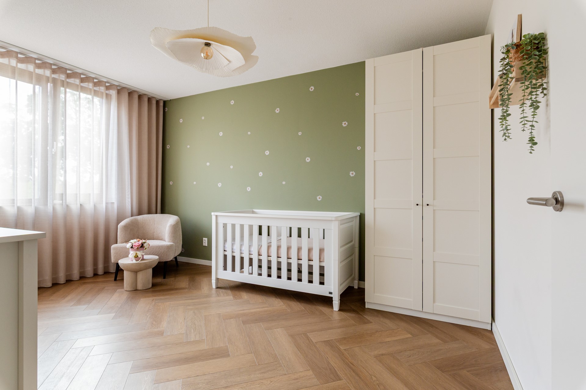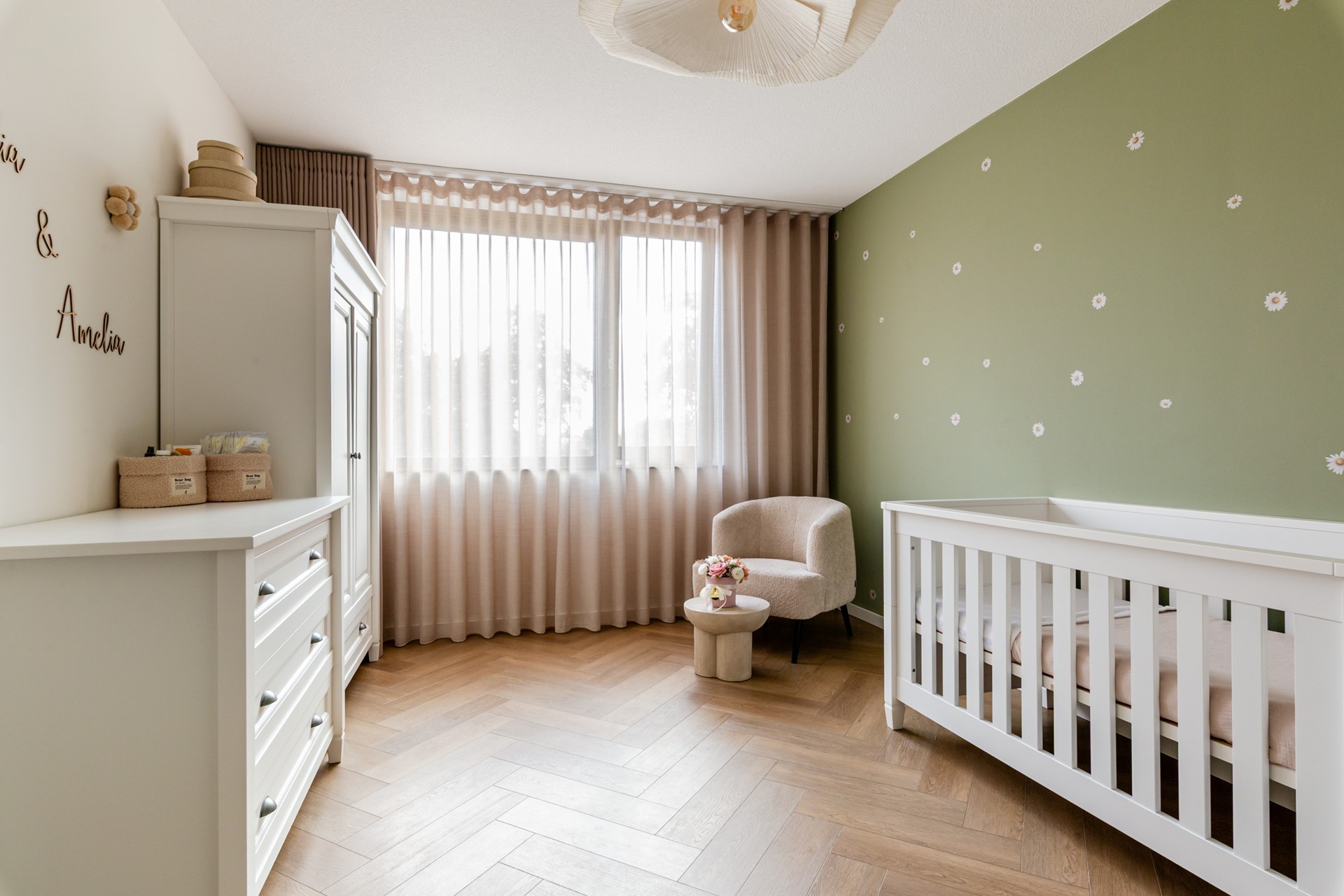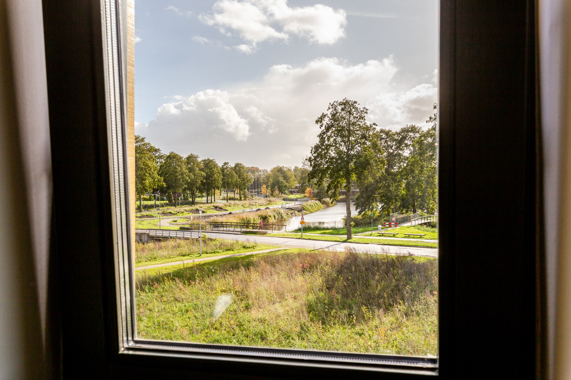 Dankzij de grote raampartij aan de voorkant, die loopt van boven tot beneden, komt er volop licht naar binnen en heb je een prachtig uitzicht over de voortuin en de groene omgeving. Ook in de woonkamer zelf zorgen de grote ramen en de lichte kleuren voor een ruimtelijk en open gevoel.