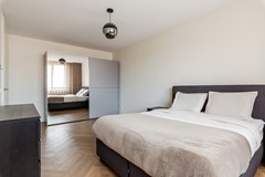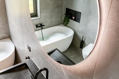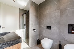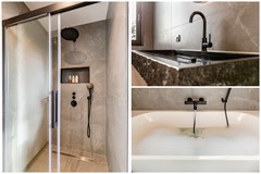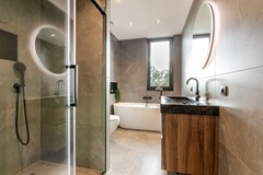 Op de eerste verdieping ligt wederom een prachtige visgraatvloer, wat zorgt voor een mooi geheel met de benedenverdieping. Hier bevinden zich drie ruime slaapkamers en een stijlvolle badkamer. De badkamer is tot in de puntjes verzorgd en voorzien van een ligbad, een aparte douche, een tweede toilet en een strak wastafelmeubel. De combinatie van moderne tegels en hoogwaardige afwerking geeft de ruimte een luxe uitstraling.