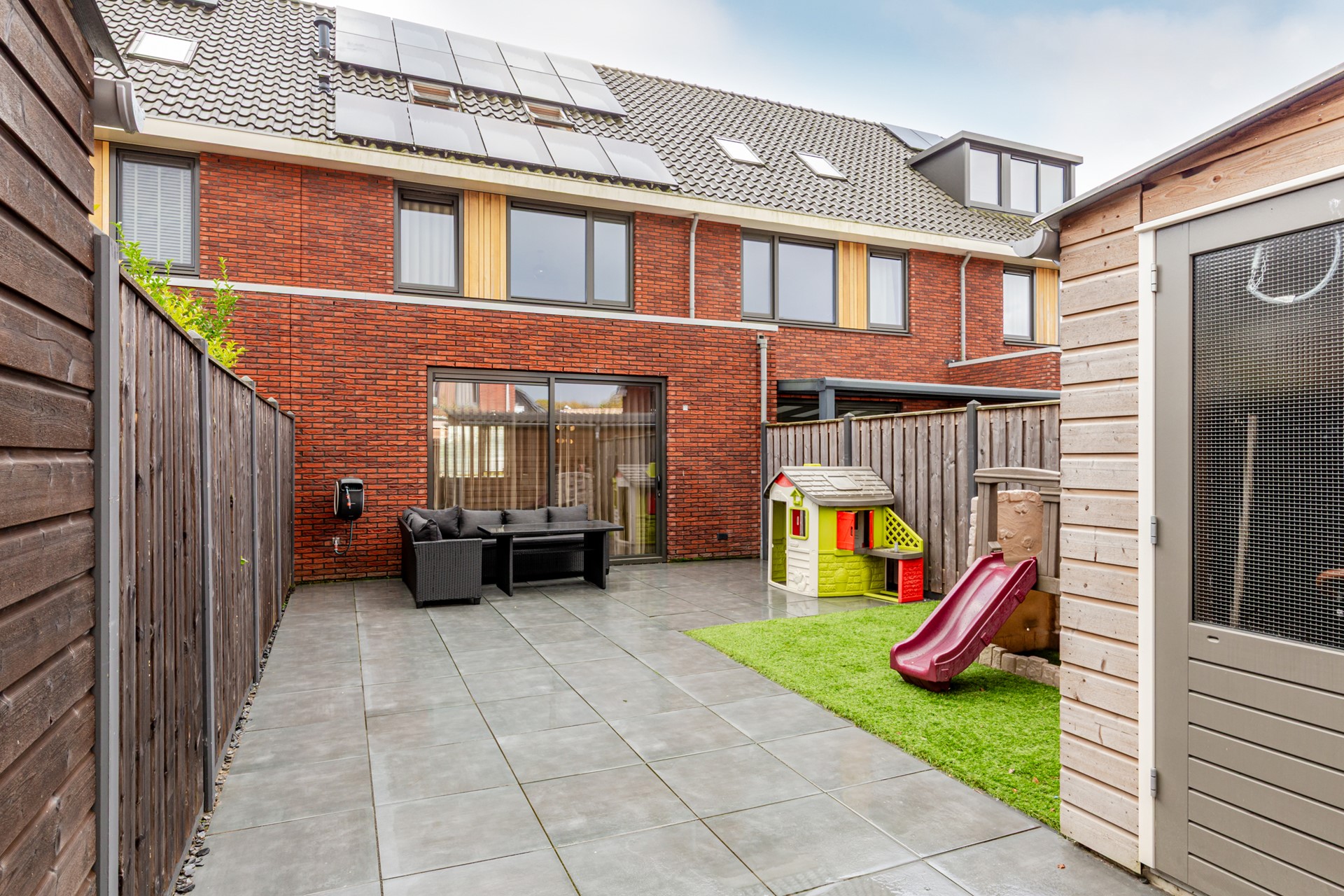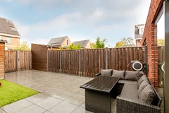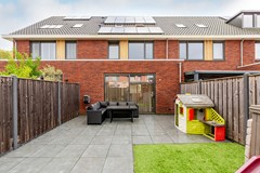 Via de schuifpui loop je zo de achtertuin in, die gunstig is gelegen op het noord-westen. Hier kun je de hele dag door van de zon genieten. De tuin is onderhoudsvriendelijk aangelegd met nette bestrating, een stukje kunstgras en houten schuttingen met betonnen palen en onderrand. Achterin de tuin staat een nette houten berging, en natuurlijk is er een achterom aanwezig.