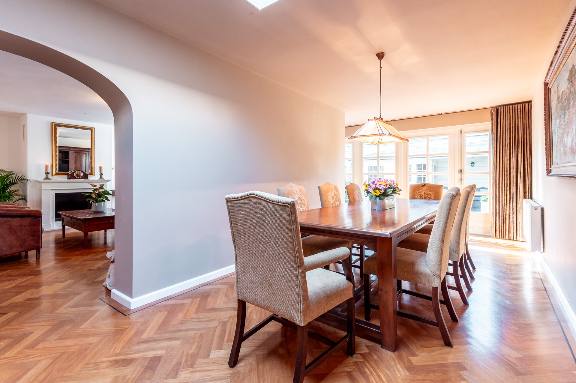 Grenzend aan de woonkamer bevindt zich de aparte eetkamer. De lichtkoepel in het plafond zorgt voor bijzonder veel daglicht, waardoor dit een heerlijke plek is om te tafelen of samen te komen.