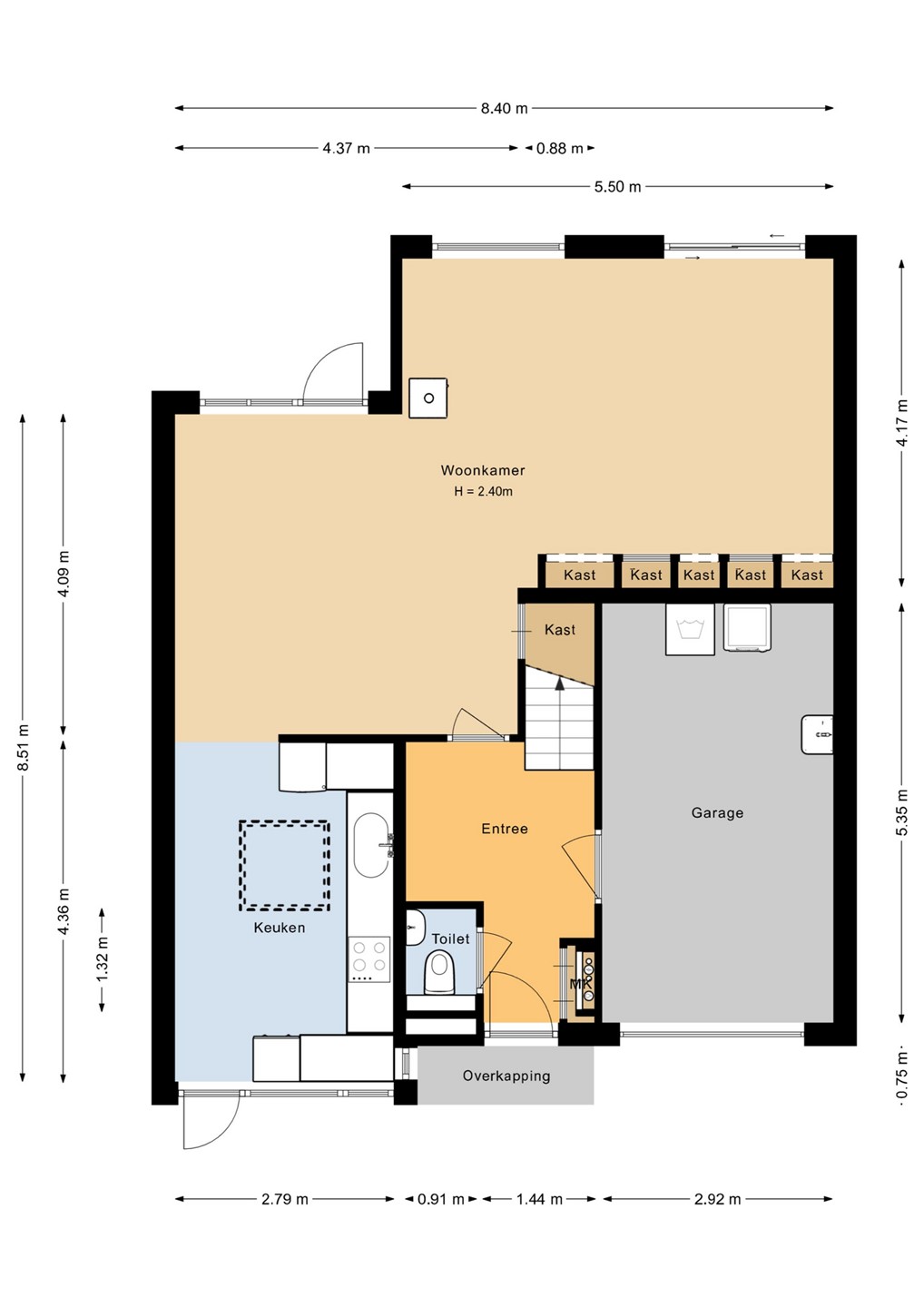 De garage is direct vanuit de hal te bereiken en biedt volop bergruimte. Ook zijn hier de aansluitingen voor de wasmachine en droger aanwezig, praktisch en efficiënt.