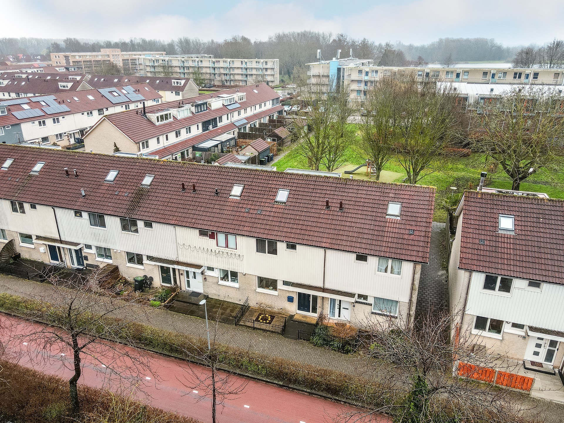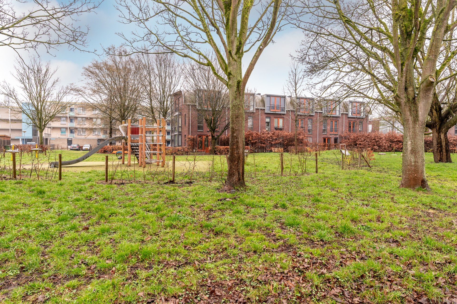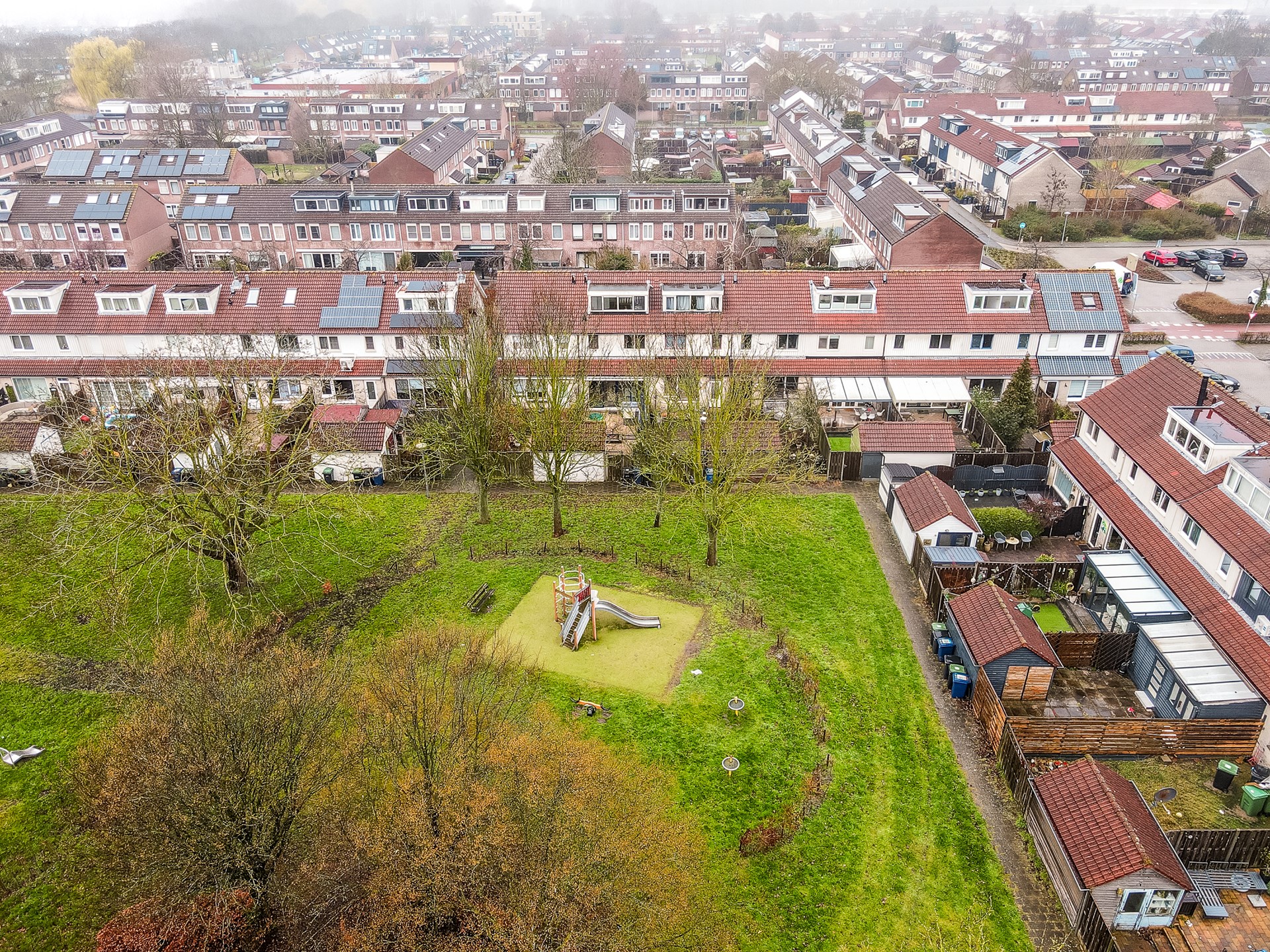 Wat deze woning extra bijzonder maakt, is de ligging aan de achterzijde. Vanuit de tuin kijk je uit op een gezellig speelveld met groen en speeltoestellen. Stel je voor: een zonnige middag, de barbecue aan, vrienden of familie op bezoek en de tuindeur open. Terwijl jij ontspannen in de tuin zit, lopen de kinderen zo het speelveld op om te spelen. Dat is het ultieme buitenleven voor een gezin.