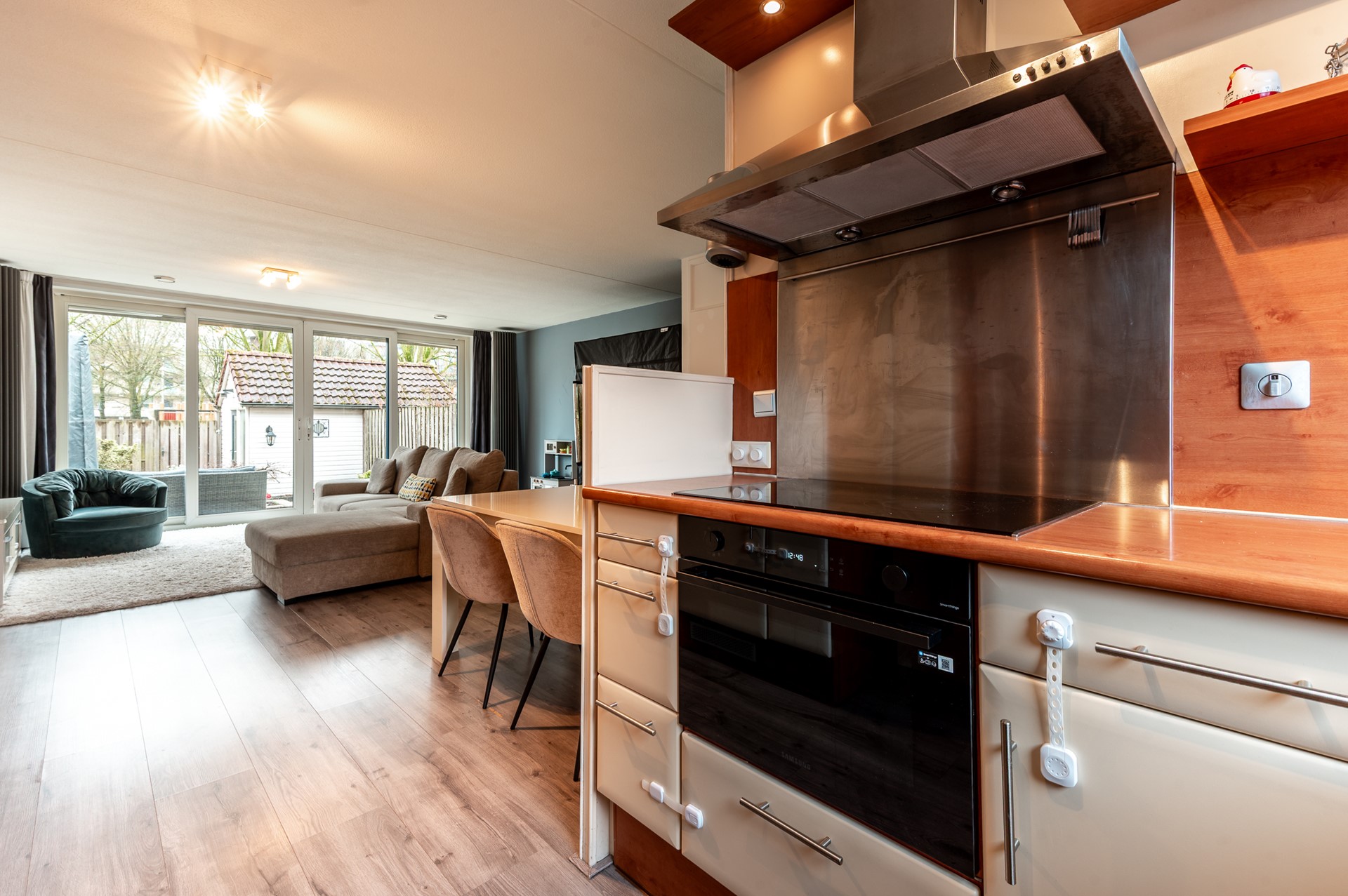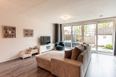 De woonkamer is tuingericht en heerlijk licht. Dankzij de grote dubbele schuifpui wordt de tuin als het ware een verlengstuk van de woonkamer. Op zonnige dagen zet je de pui open en geniet je van een fijne verbinding tussen binnen en buiten.