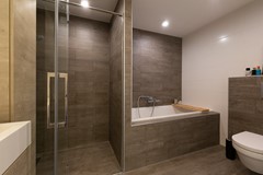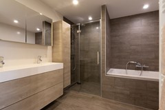 De badkamer straalt comfort en stijl uit. Alles is keurig en zeer netjes afgewerkt, met een warme en tijdloze kleurstelling die rust en luxe combineert. Hier vind je alles wat je nodig hebt voor een ontspannen start of afsluiter van de dag: een ruim ligbad om heerlijk in weg te dromen, een aparte douche voor het dagelijkse gemak en een toilet. Het moderne wastafelmeubel met dubbele kraan maakt de badkamer extra praktisch, zeker voor een druk gezin in de ochtend. Dankzij de hoogwaardige materialen en verzorgde uitstraling voelt deze badkamer als een kleine wellnessruimte in je eigen huis.