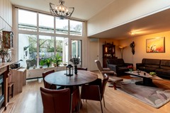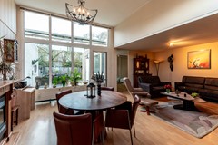 De centrale living vormt het hart van de woning. Deze lichte ruimte wordt gekenmerkt door het hoge plafond, de grote raampartijen en de hoge glazen pui richting de tuin. Hierdoor ontstaat een ruimtelijk gevoel en valt het daglicht prachtig binnen.