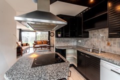 Aan de voorzijde bevindt zich de ruime keuken, die direct opvalt door de speelse vorm en de charmante ronding aan de voorzijde. De keuken beschikt over veel kast- en werkruimte en is voorzien van een kookeiland, wat het een heerlijke plek maakt om te koken en samen te komen.