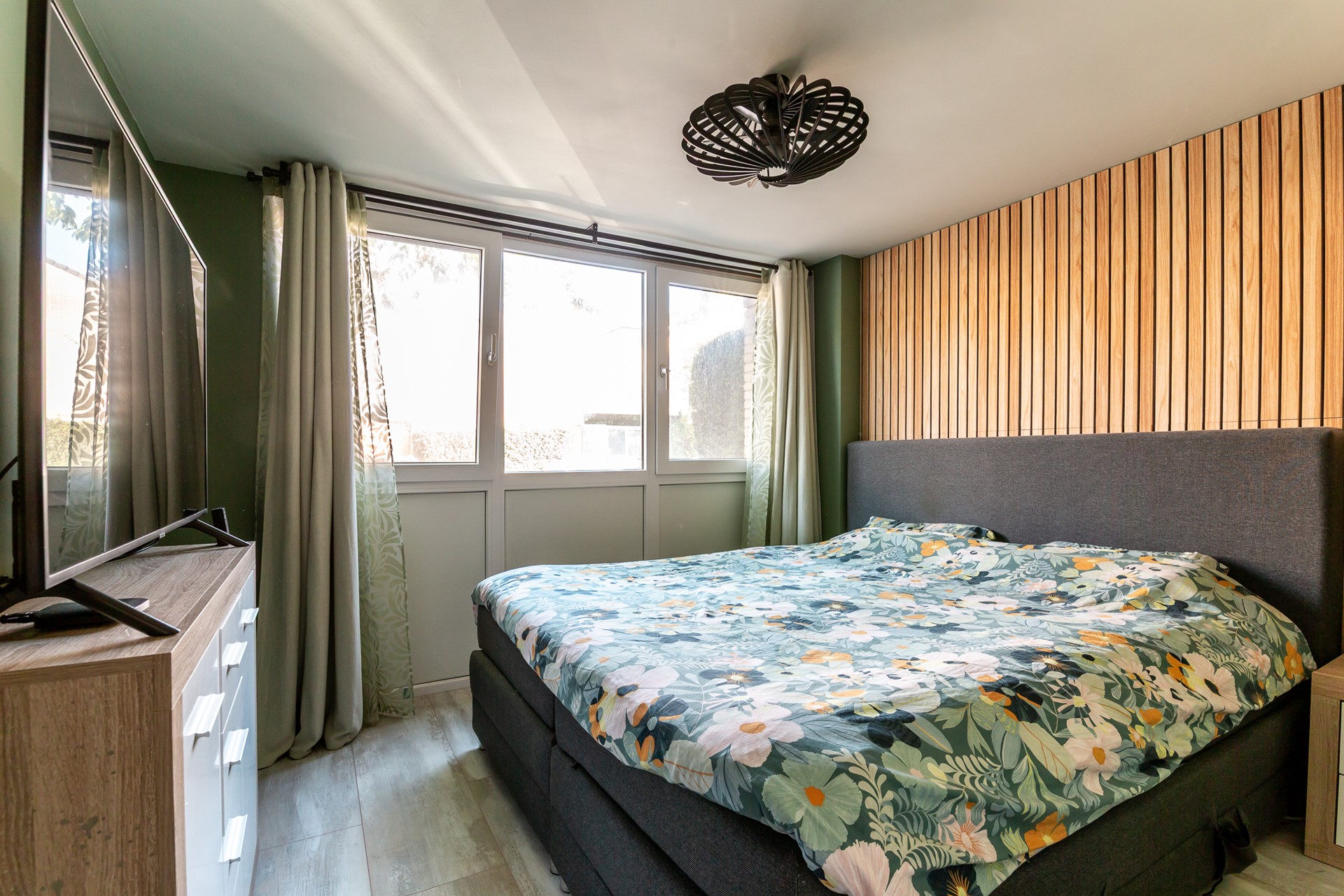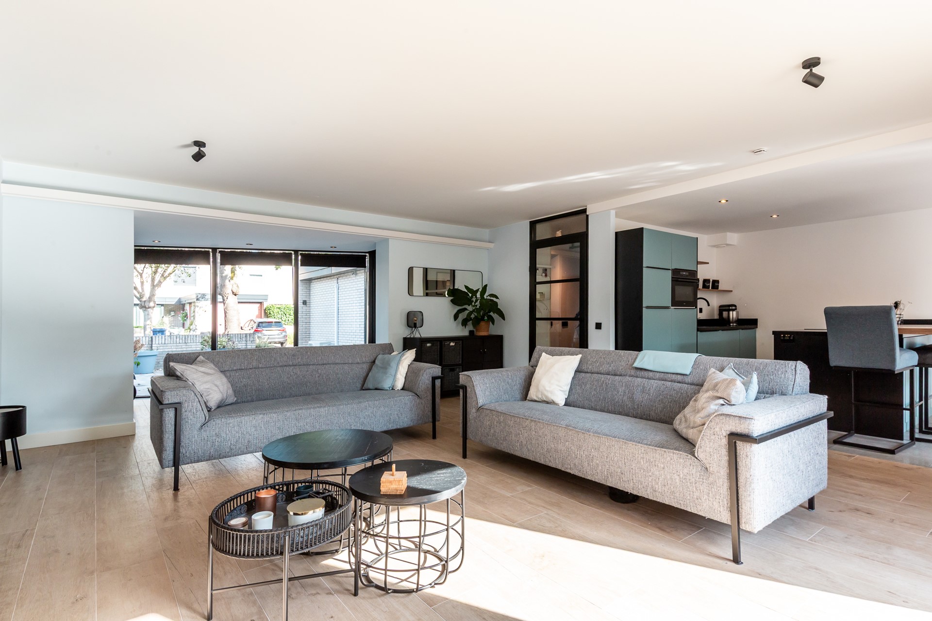 Bij binnenkomst merk je direct de moderne en verzorgde afwerking. De hal geeft toegang tot de inpandige berging en tot een praktische slaapkamer aan de voorzijde, ideaal als logeerplek, thuiswerkruimte of speelkamer voor de kinderen. Loop je door, dan kom je in de royale woonkamer. Dankzij de strakke vloer met vloerverwarming (2024), de gladgestucte wanden en plafonds en de frisse uitstraling voelt deze ruimte heerlijk eigentijds aan. De grote ramen zorgen voor veel lichtinval en een prettig uitzicht op de achtertuin.