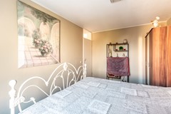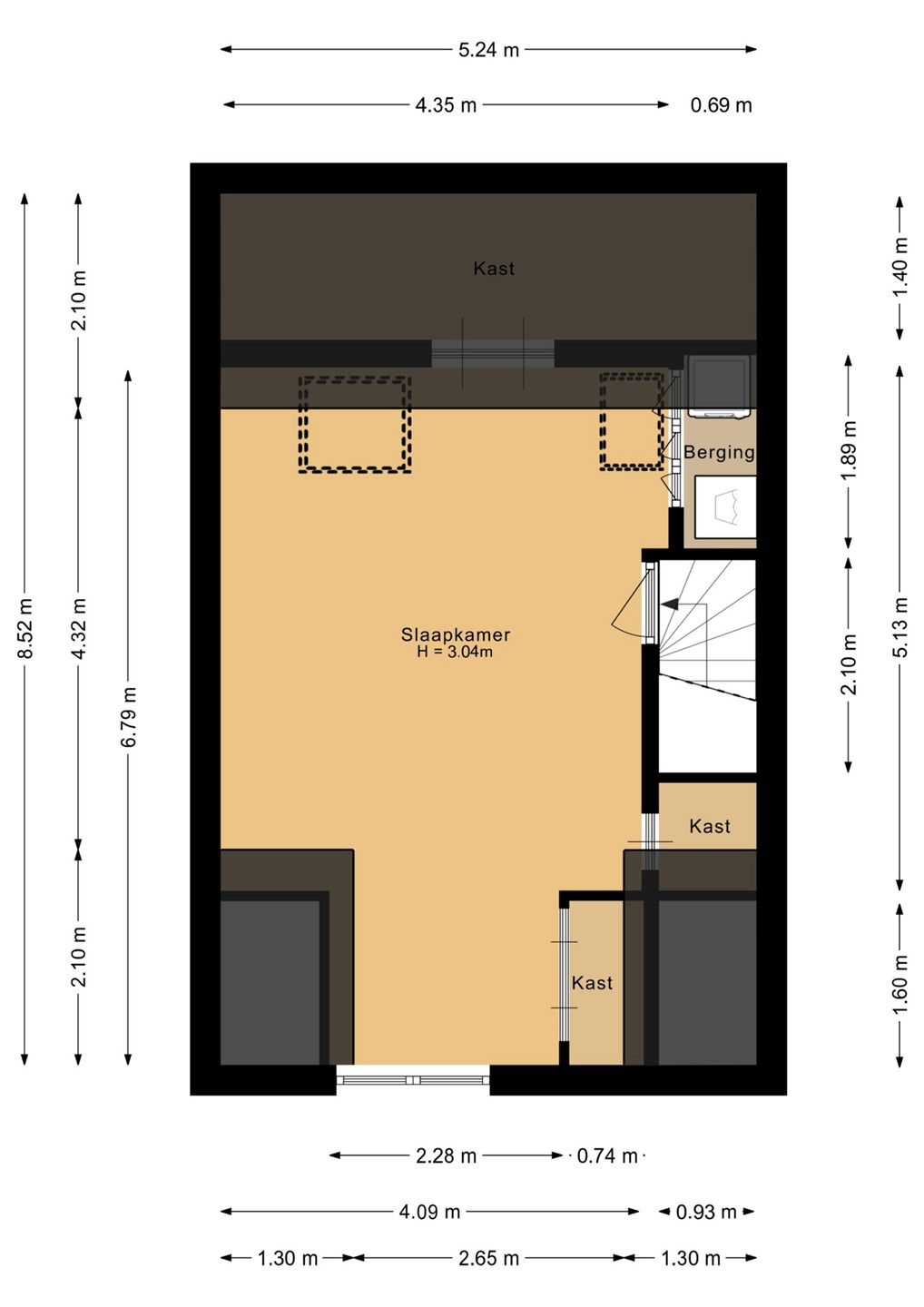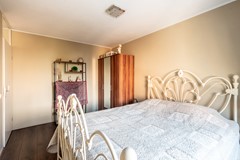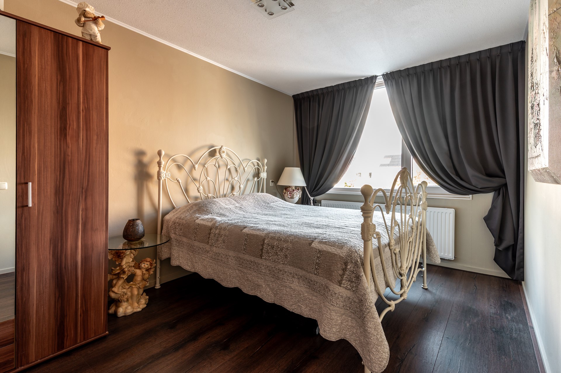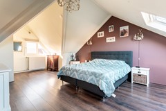 De zolderverdieping is verrassend ruim en ingericht als riante vierde slaapkamer met veel lichtinval dankzij de kunststof raamkozijnen. Ook hier vind je een airco die kan koelen en verwarmen. Daarnaast is er volop bergruimte, slim weggewerkt achter knieschotten en in een keurige ingebouwde kast bevind zich de wasmachine en droger opstelling.