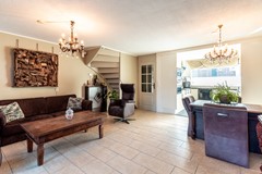 De woonkamer voelt ruim aan doordat de trapkast is weggehaald. Grote kunststof kozijnen (2022) en de kunststof dubbele openslaande deuren zorgen voor veel licht. De begane grond is afgewerkt met een nette tegelvloer inclusief vloerverwarming. Extra pluspunt is de airco die zowel kan koelen als verwarmen.