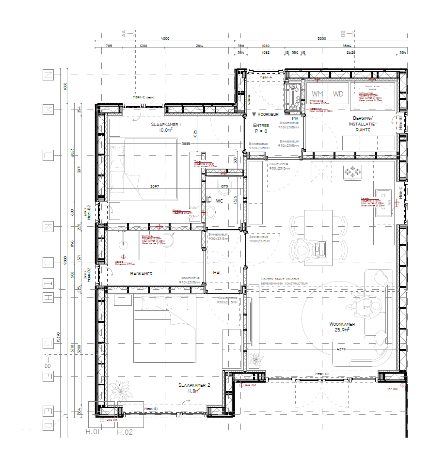- Afwerking binnenmuren (gips, stuc, extra OSB)