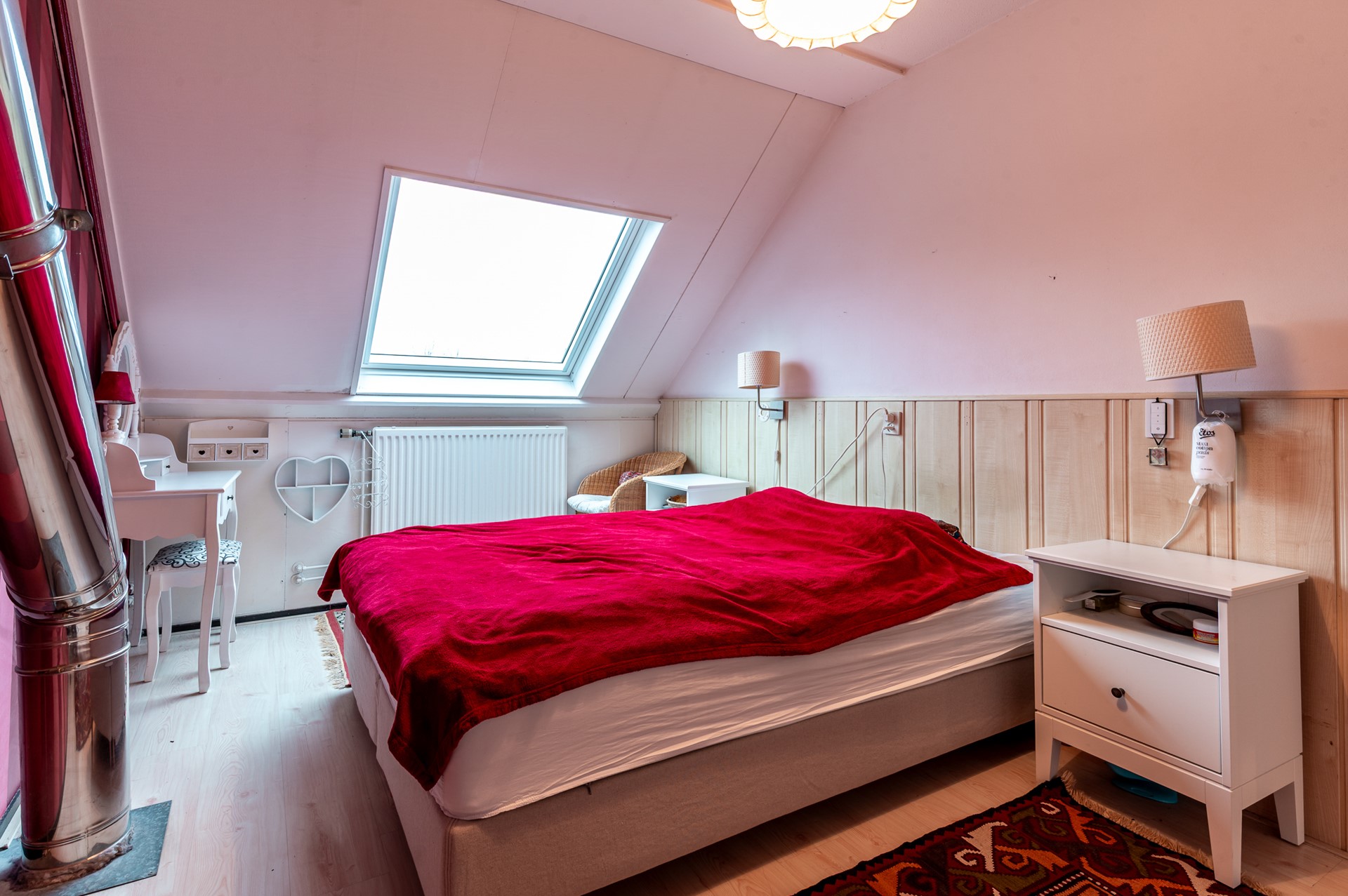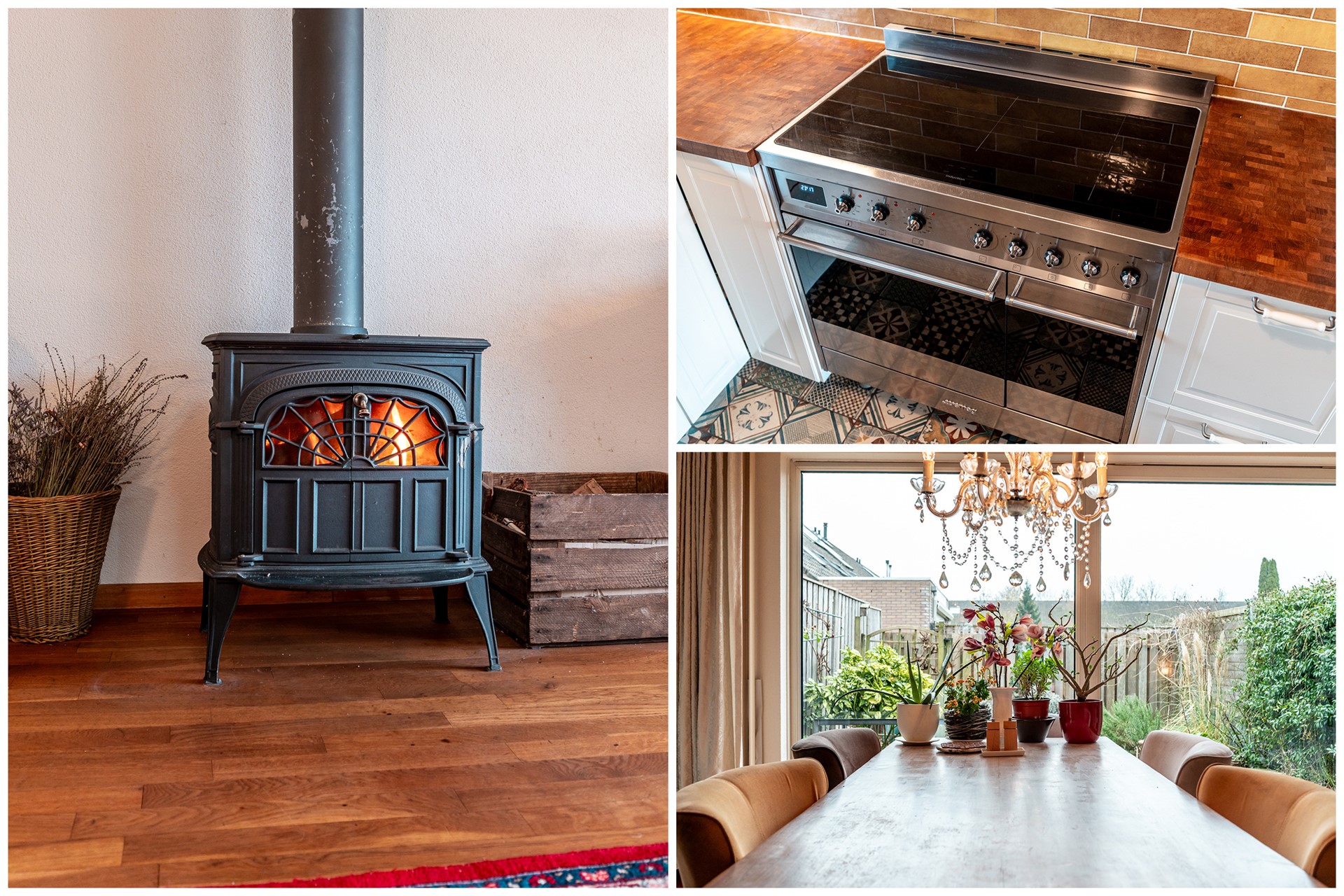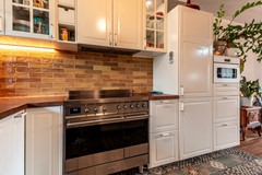 Aan de voorzijde bevindt zich de keuken, opgesteld met zicht op de straat en voorzien van alle gemakken die je in het dagelijks gebruik nodig hebt. Hier kook je met plezier, terwijl je contact houdt met de omgeving. De houtkachel in de woonkamer vormt een sfeervolle blikvanger en maakt het geheel helemaal af – vooral in de koudere maanden een heerlijke toevoeging aan het wooncomfort.