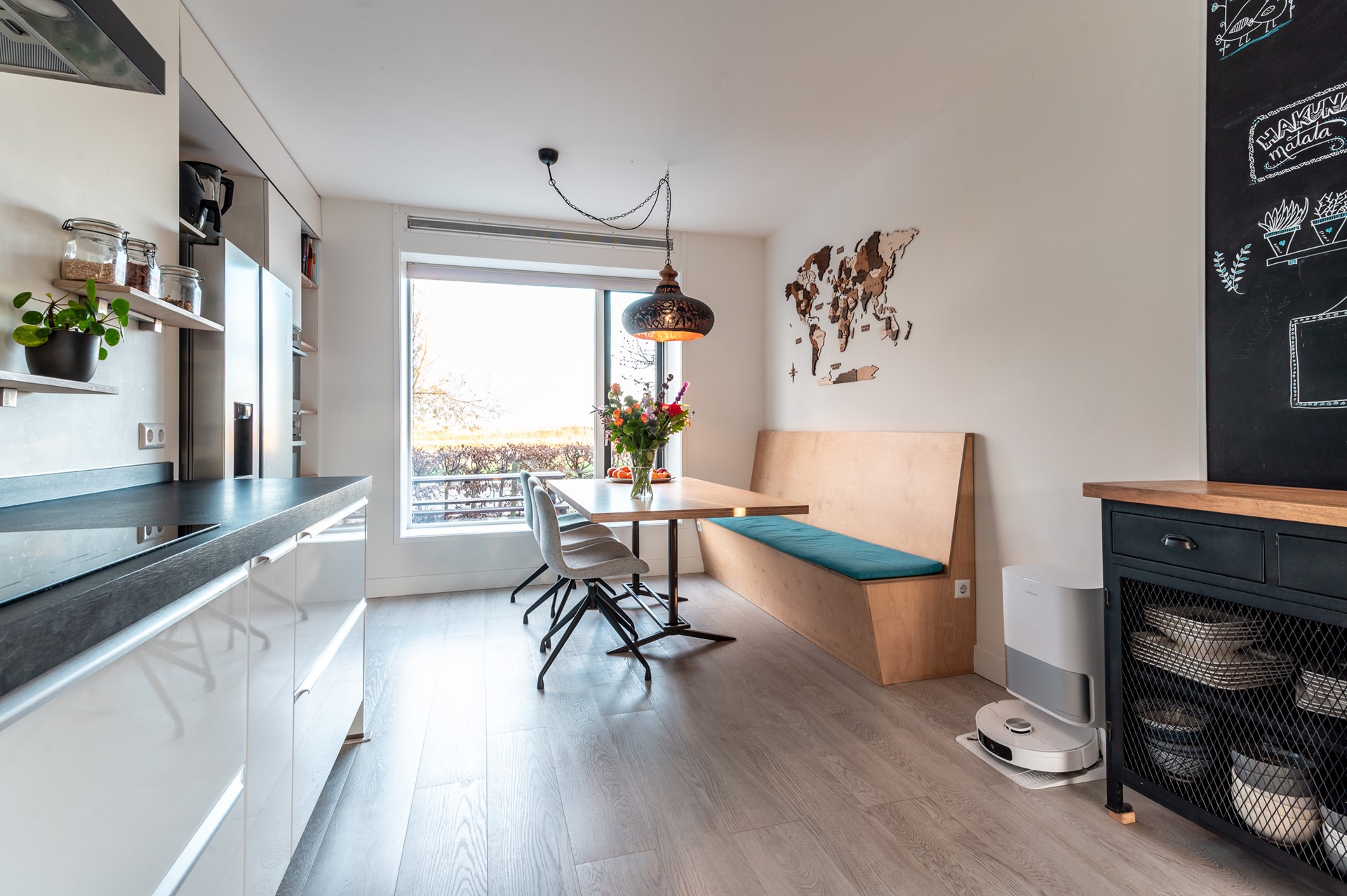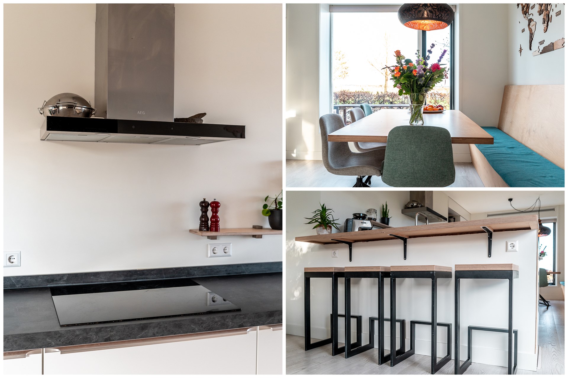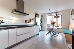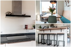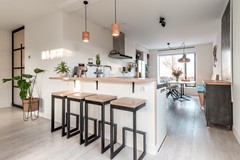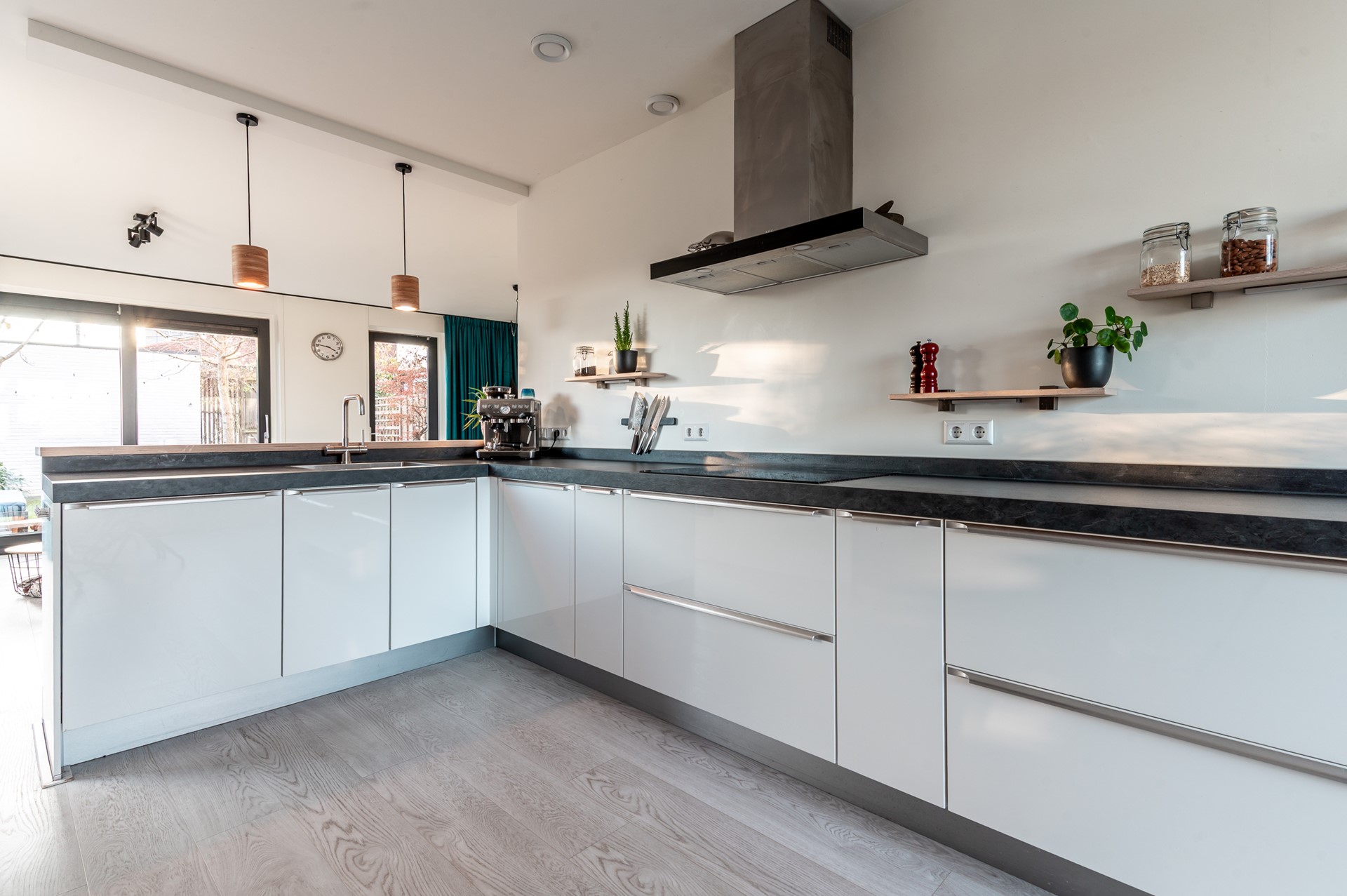 De keuken aan de voorzijde van de woning is in 2021 vernieuwd en vormt een prachtig geheel met de rest van de begane grond. Door de royale raampartijen valt er veel daglicht binnen en heb je tijdens het koken zicht op de ruime voortuin en richting het water van de Noorderplassen. De keuken heeft een moderne, tijdloze uitstraling en is ruim opgezet, met meer dan voldoende bergruimte in de kasten en lades. Het werkblad biedt alle ruimte om comfortabel te koken of samen te bereiden. Qua uitrusting is de keuken helemaal van nu. Zo beschik je over een losse Amerikaanse koelkast, een combi-oven, een combi-magnetron en een inductiekookplaat. De vaatwasser is fraai geïntegreerd en de heetwaterkraan zorgt voor extra gemak in het dagelijks gebruik. Het geheel vormt een functionele en sfeervolle leefkeuken waar je met plezier staat te koken, terwijl de open verbinding met de woonkamer ervoor zorgt dat je altijd in contact blijft met familie of gasten.