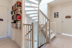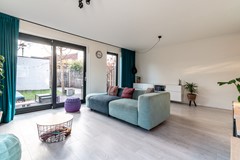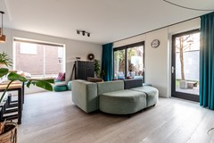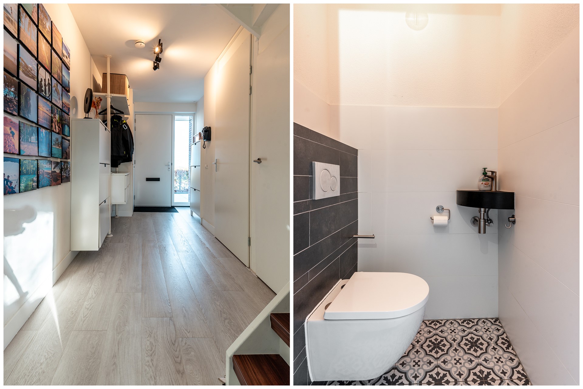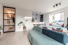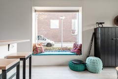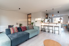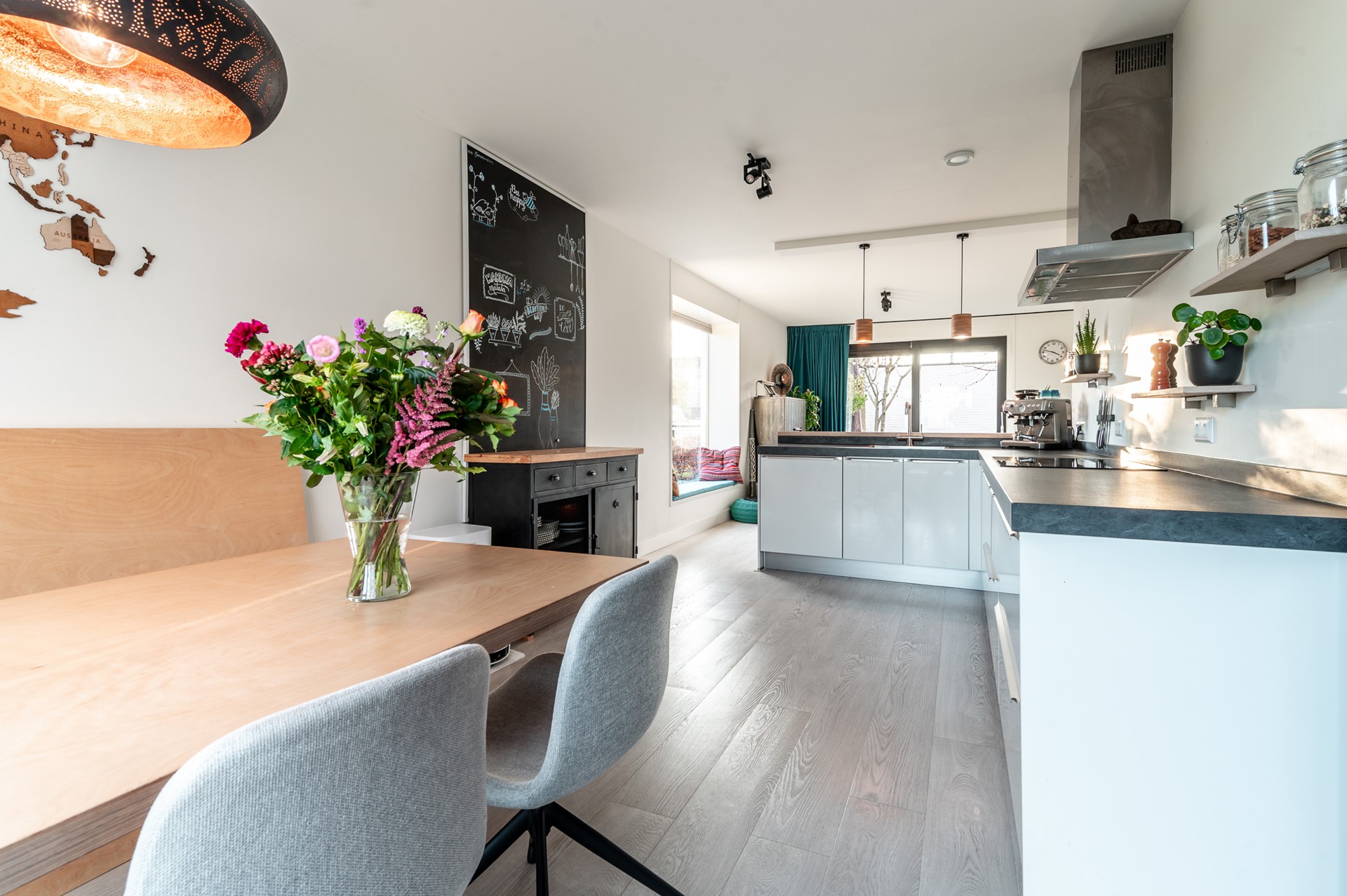 De ruime hal biedt toegang tot het toilet, de meterkast, de trapopgang naar boven en uiteraard de woonkamer. De woonkamer is bijzonder prettig van formaat, heerlijk licht en afgewerkt met een stijlvolle vloer (vernieuwd in 2021) met vloerverwarming. Een groot pluspunt is het zijraam op de begane grond: omdat de woning op een hoek ligt, is hier een knus zitje gecreëerd waar je geniet van de zon die binnenvalt.