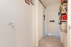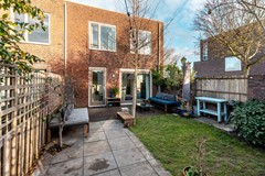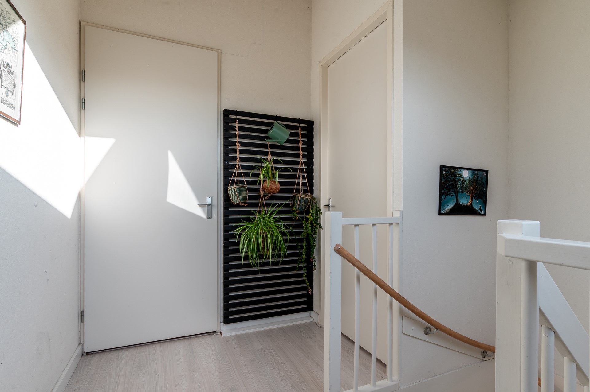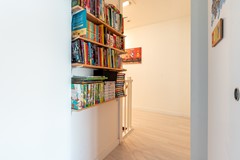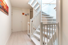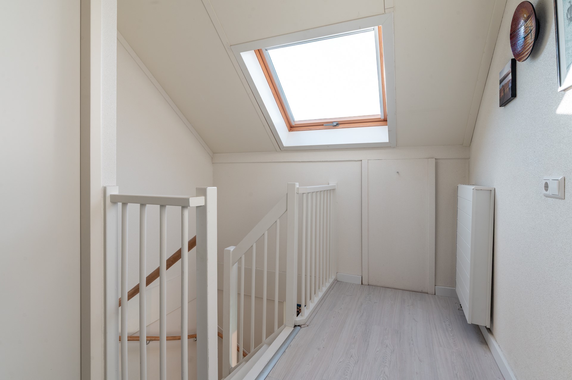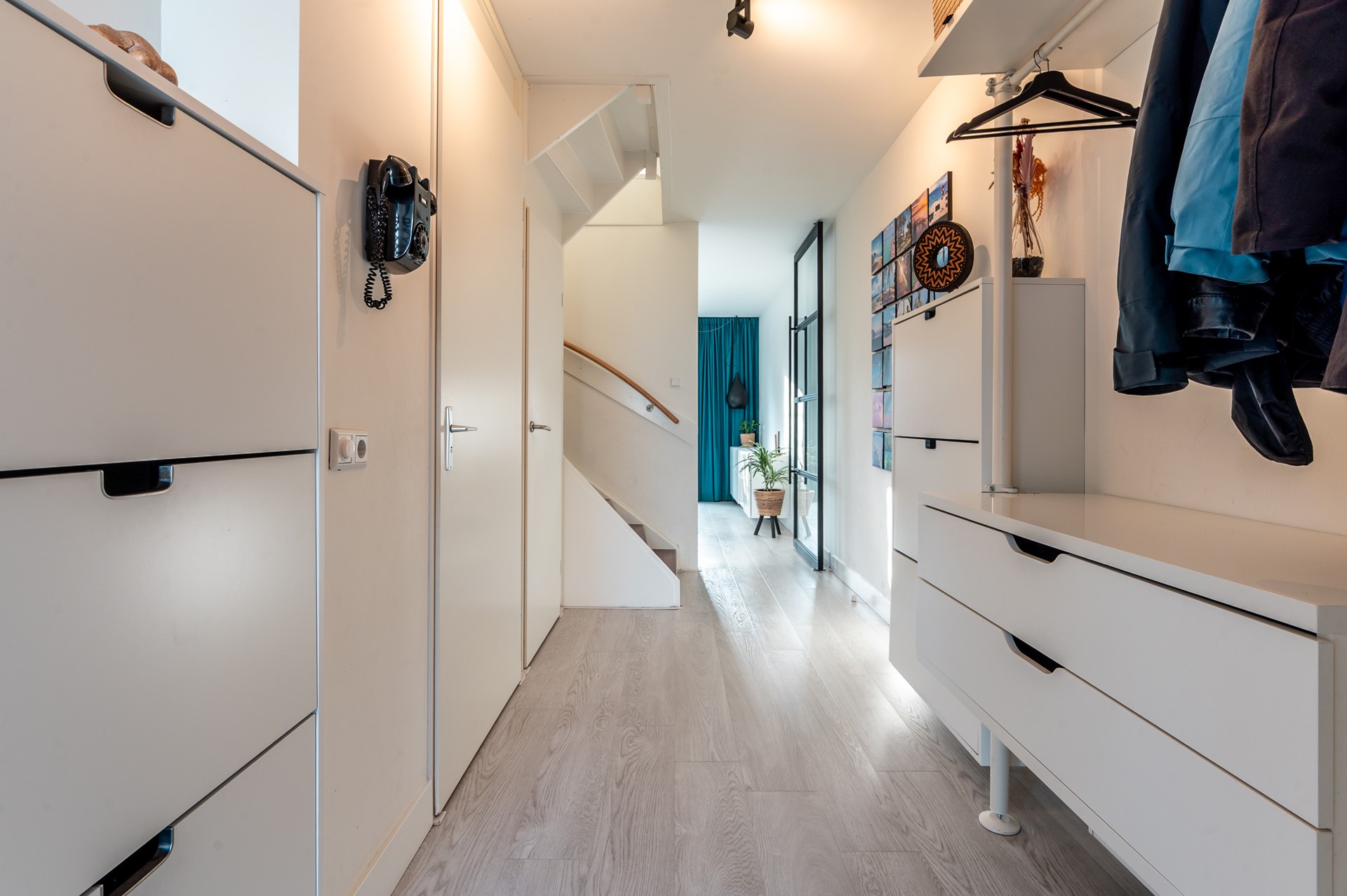 De ruime hal biedt toegang tot het toilet, de meterkast, de trapopgang naar boven en uiteraard de woonkamer. De woonkamer is bijzonder prettig van formaat, heerlijk licht en afgewerkt met een stijlvolle vloer (vernieuwd in 2021) met vloerverwarming. Een groot pluspunt is het zijraam op de begane grond: omdat de woning op een hoek ligt, is hier een knus zitje gecreëerd waar je geniet van de zon die binnenvalt.