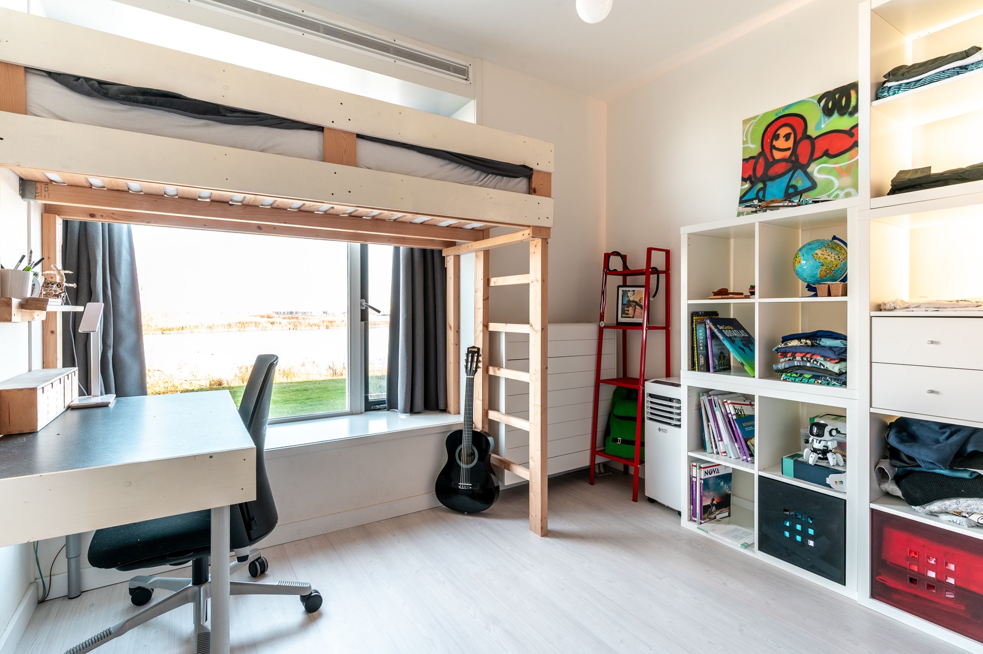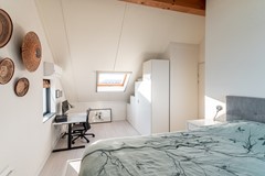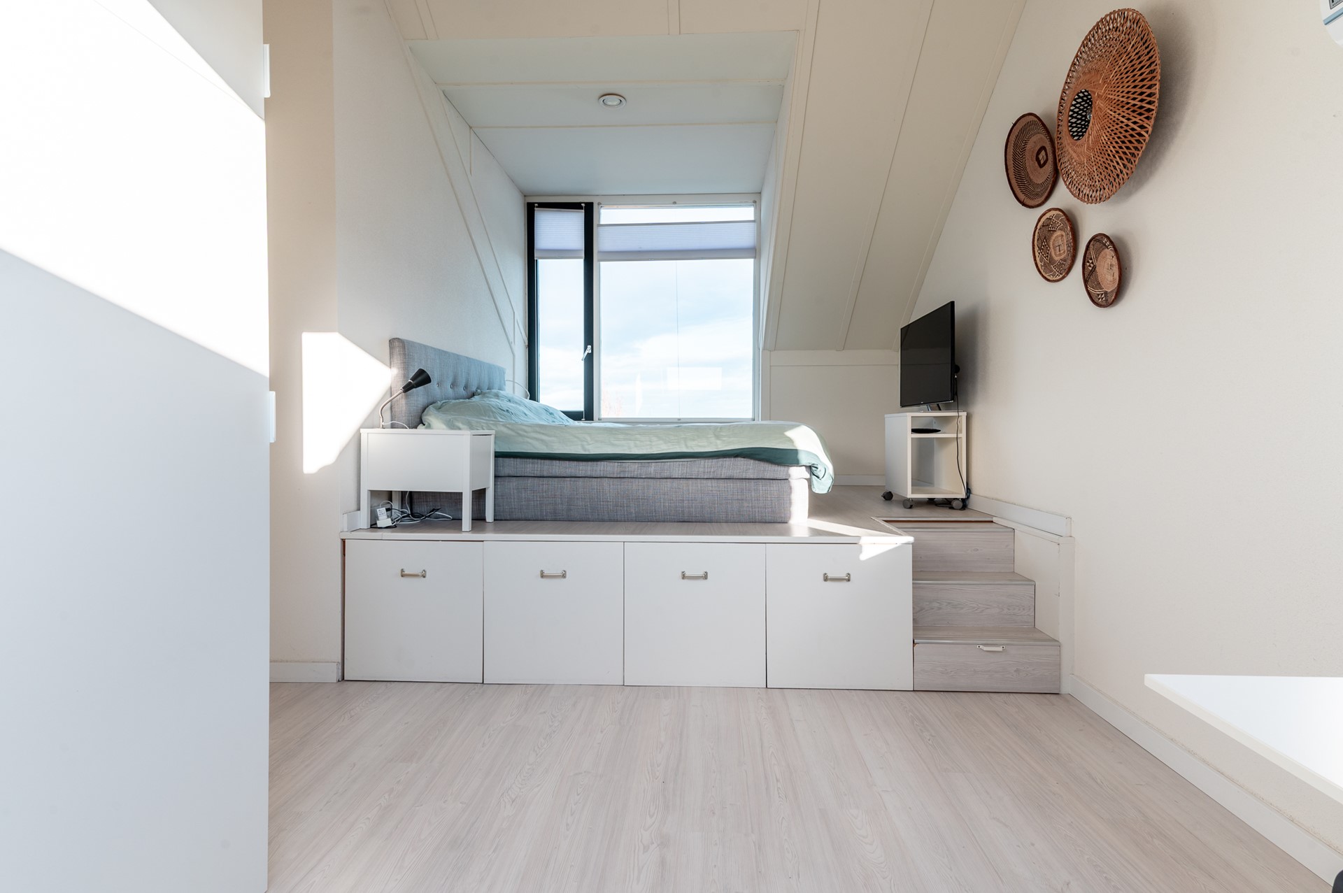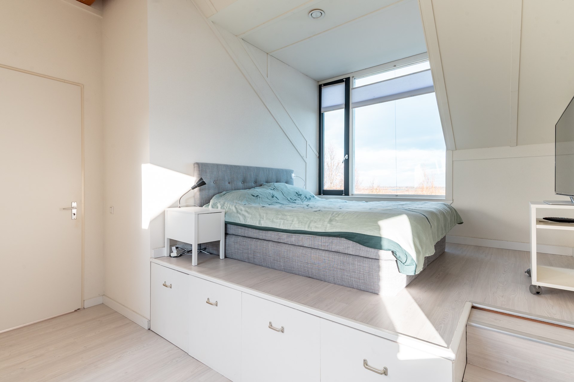 De tweede verdieping is een plek die onmiddellijk indruk maakt. Hier bevindt zich een royale slaapkamer die door de enorme raampartij een spectaculair uitzicht biedt over de Noorderplassen. Dit is zo’n kamer waar je ’s ochtends wakker wordt met het gevoel alsof je midden in het natuurgebied leeft, dankzij het wijdse panorama aan de voorzijde. De ruimte is groot genoeg om volledig naar eigen wens in te richten en voelt door het vele daglicht heerlijk ruim en luxe aan. Op deze verdieping is ook een tweede badkamer gecreëerd, die in 2021 is gerealiseerd. Deze badkamer beschikt over een douche, een toilet en de aansluitingen voor de wasmachine en droger, waardoor deze verdieping een bijzonder praktische en comfortabele leeflaag vormt. Het geheel geeft de woning een extra stukje luxe en maakt het huis ideaal voor grotere huishoudens, of juist voor wie graag een eigen verdieping als master suite wil benutten.