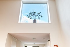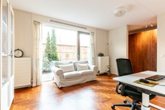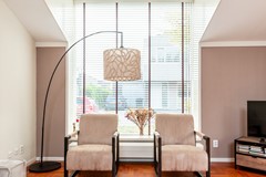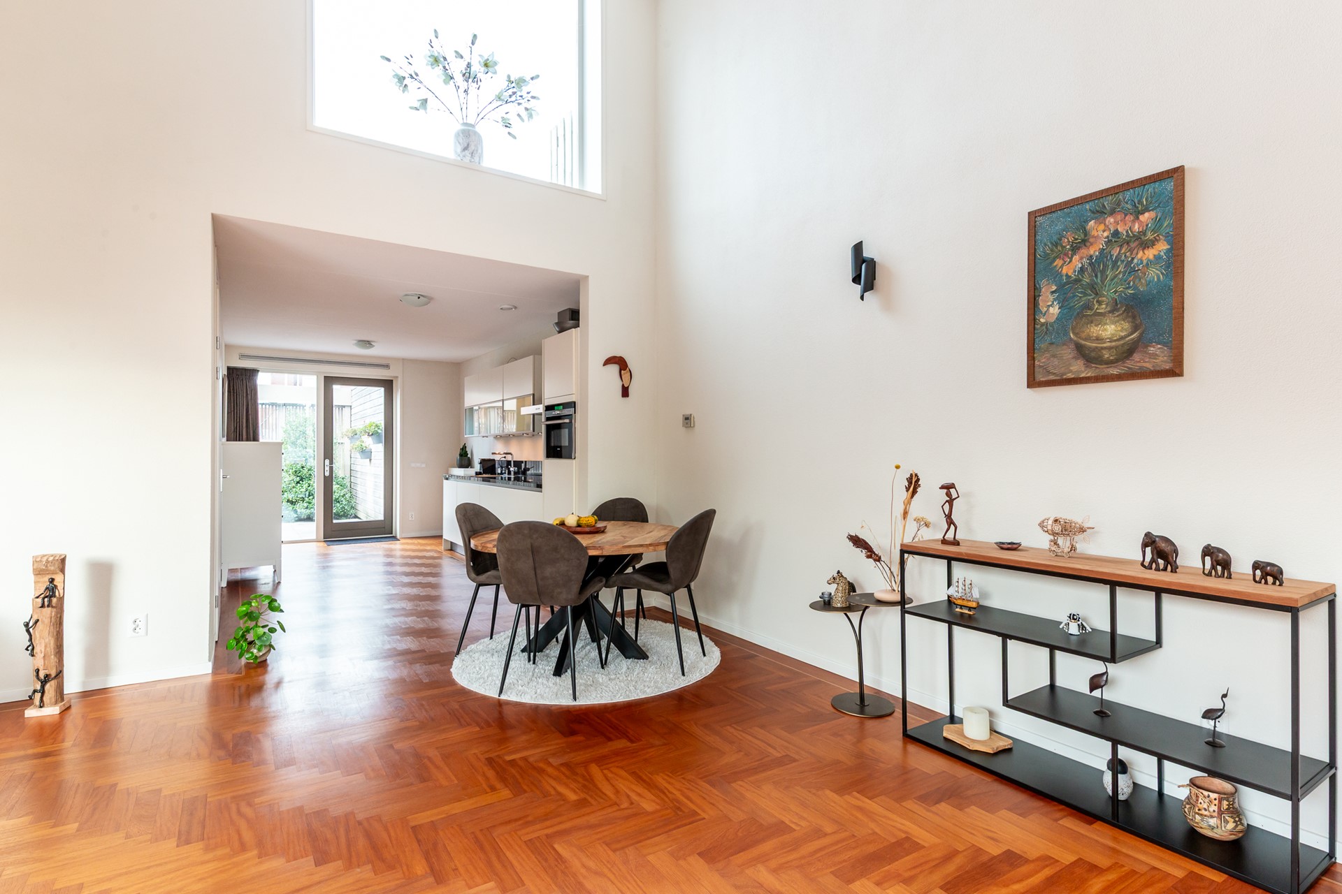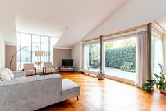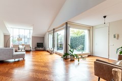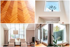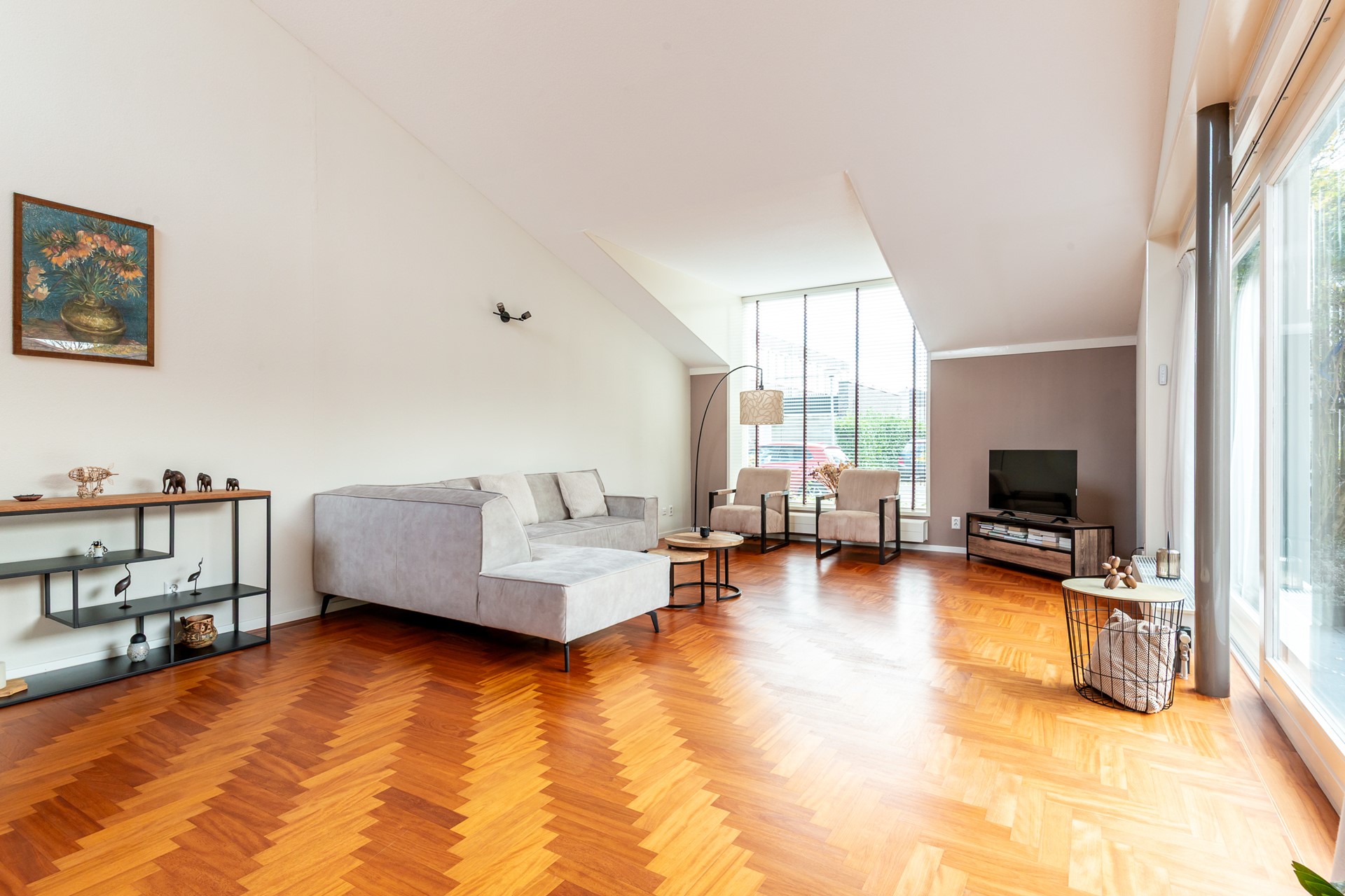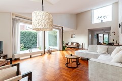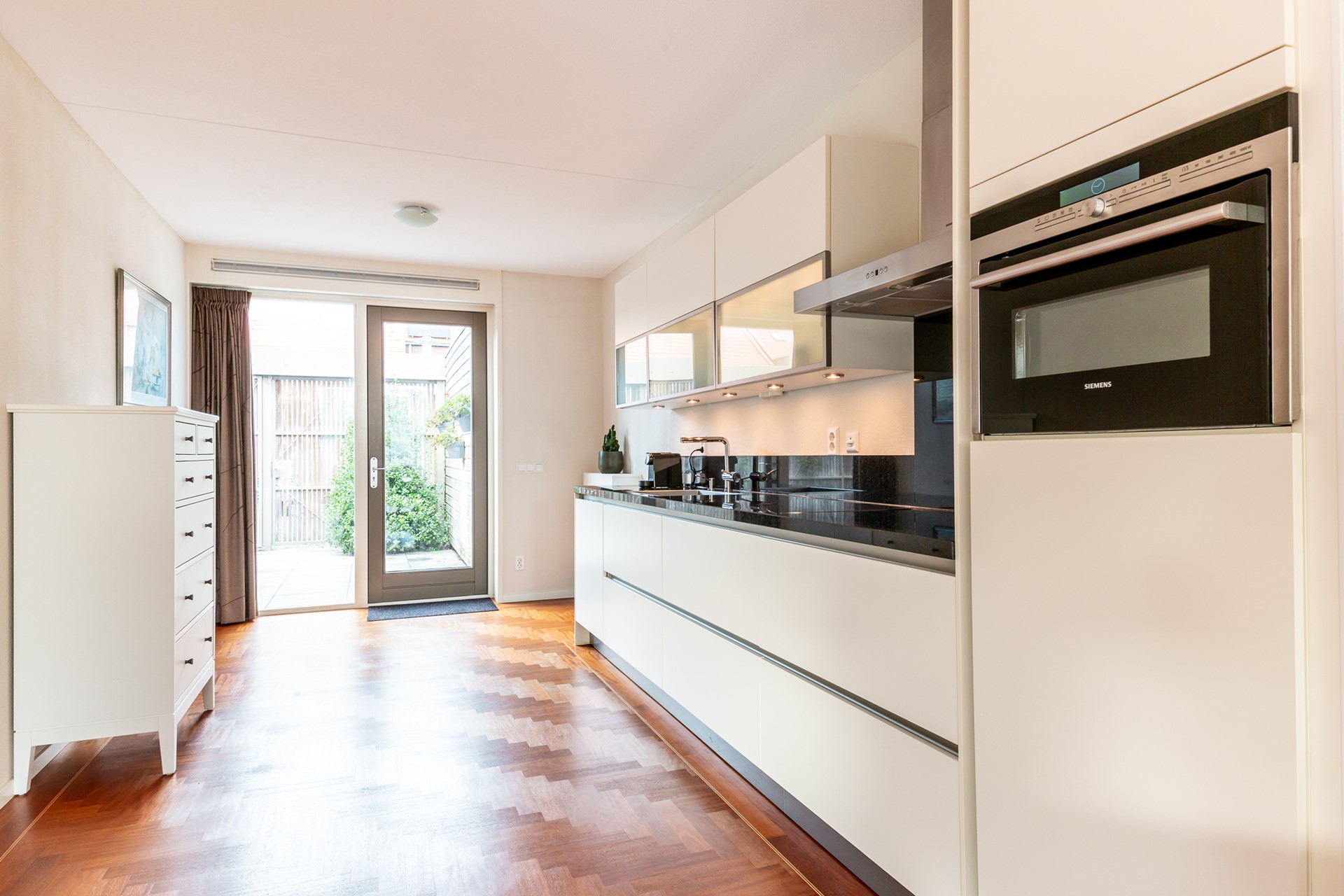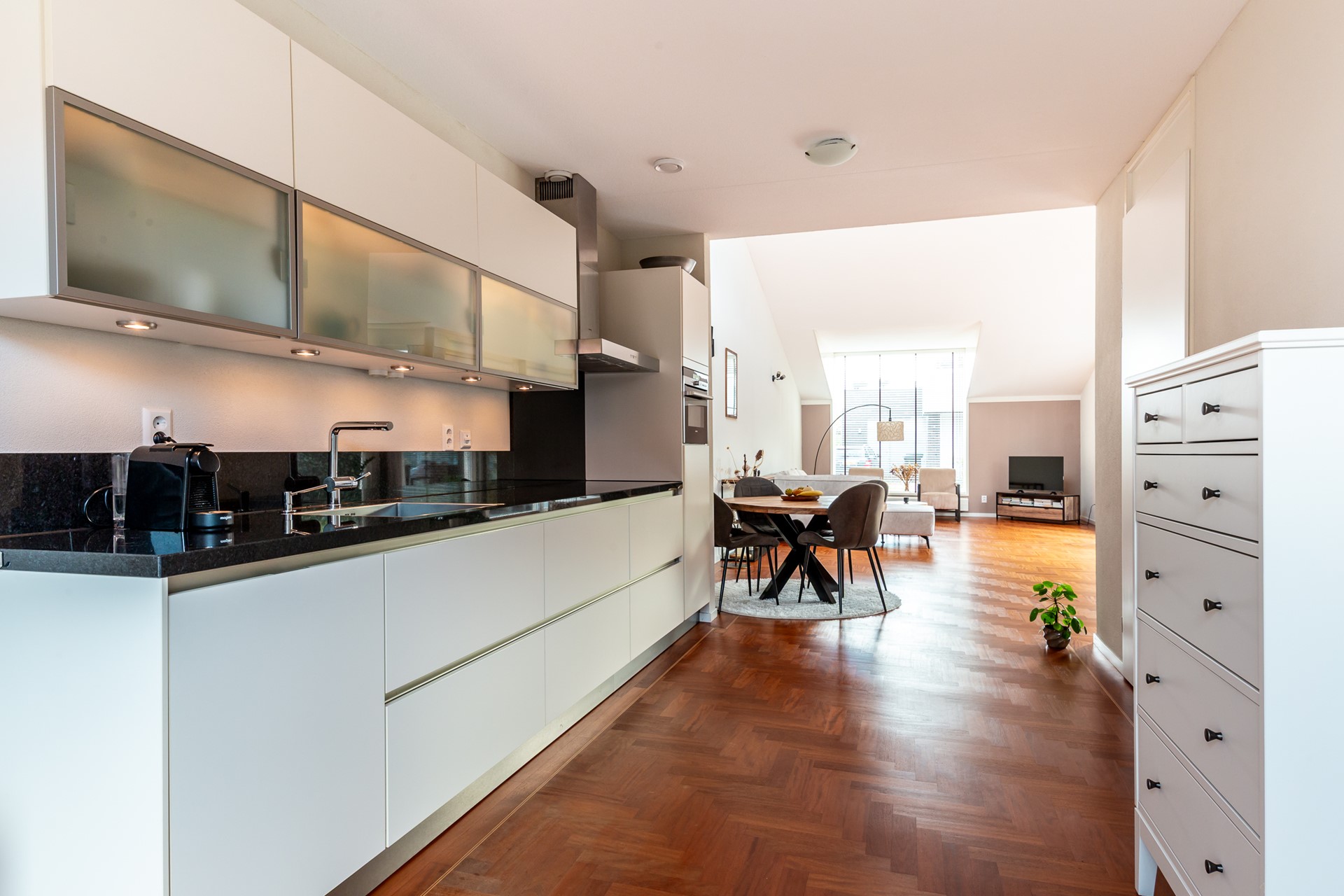 De ruime woonkamer valt direct op door de unieke architectuur. De grote raampartijen en een schuifpui zorgen voor een zee aan licht. De open keuken aan de achterzijde is modern en volledig uitgerust met hoogwaardige inbouwapparatuur: een combimagnetron, koelkast, inductiekookplaat, vaatwasser en een fraai granieten werkblad. Tevens heeft u in de keuken nog de beschikking over een handige bergkast, ideaal voor uw boodschappen. De begane grond is verder voorzien van een stijlvolle massief houten parketvloer.