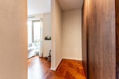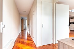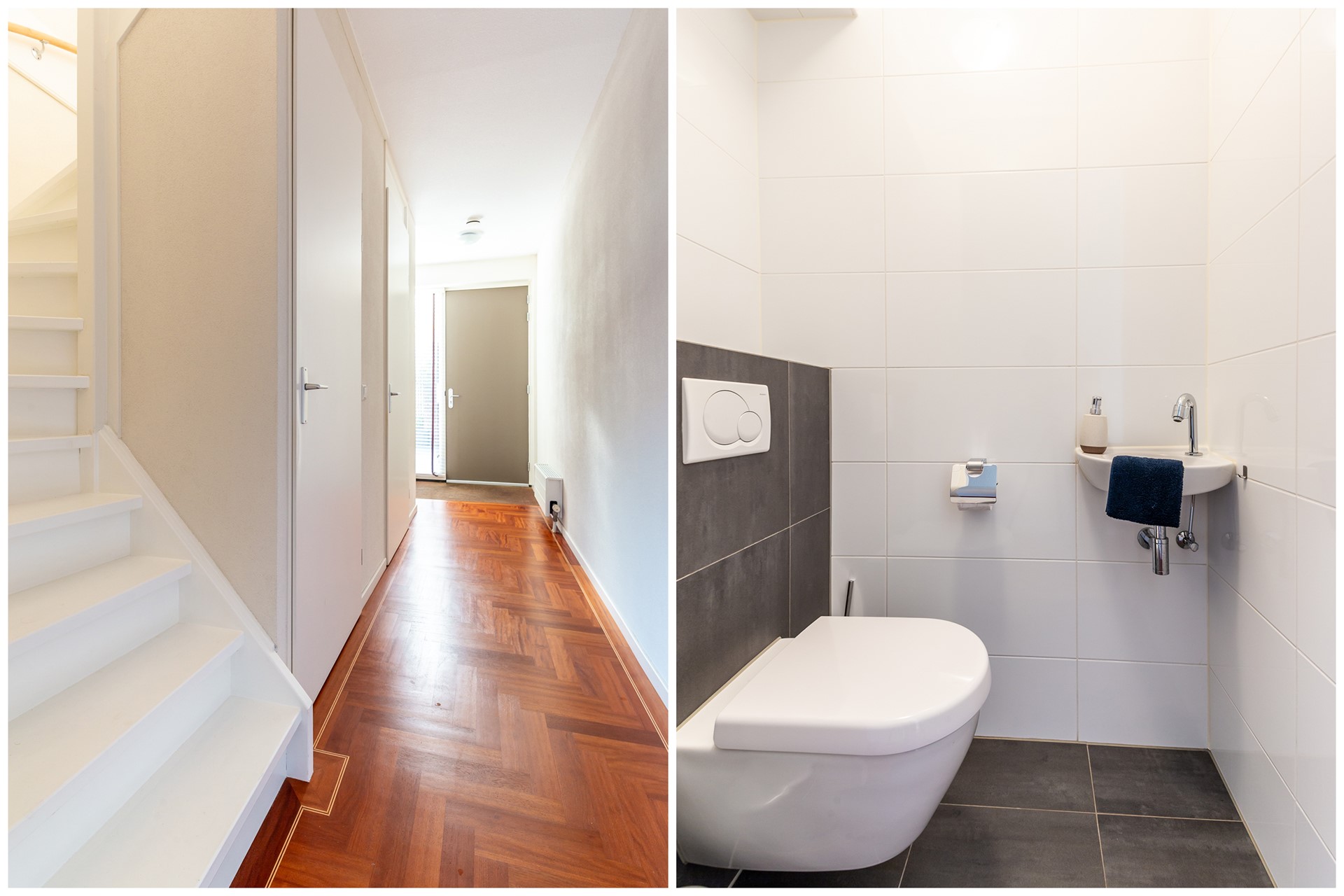 Via de afgesloten patio, bereikbaar via een loopdeur met videodeurbel, betreed je de woning. De hal biedt toegang tot het moderne toilet met wastafel (volledig betegeld) en een praktische trapkast met aansluitingen voor wasmachine en droger.