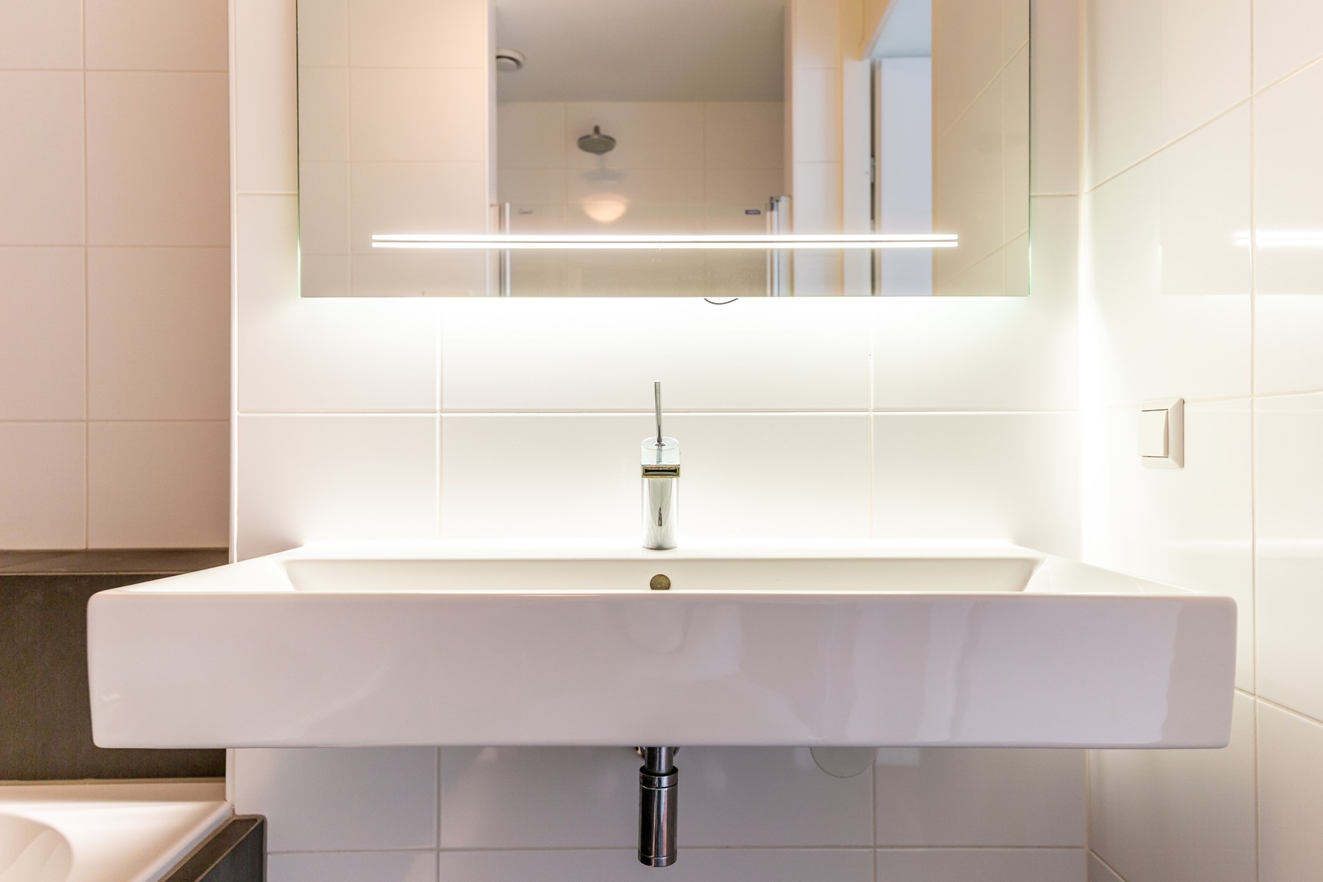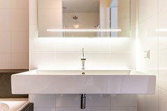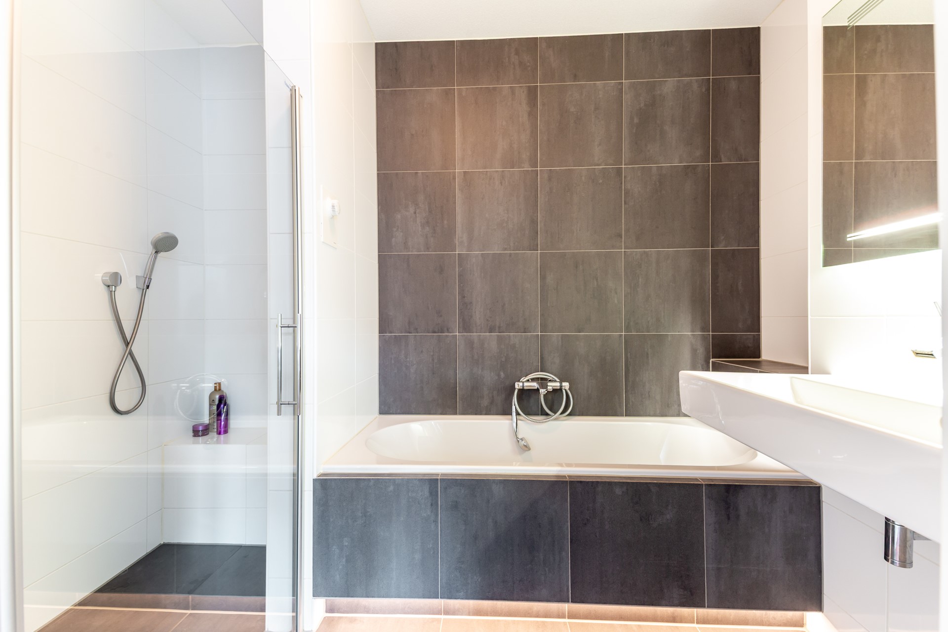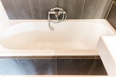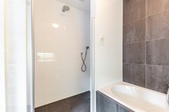 De slaapkamer op de begane grond biedt direct toegang tot de achtertuin, beschikt over een ruime inloopkast en een eigen badkamer met ligbad, inloopdouche en wastafel. Verder is de badkamer keurig betegeld tot aan het plafond en strak afgewerkt.