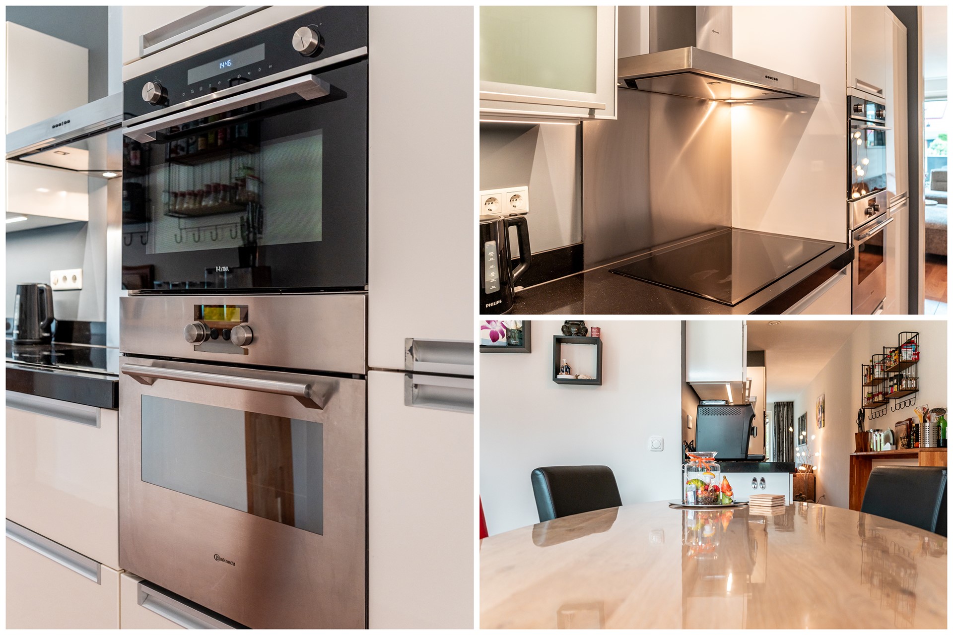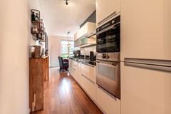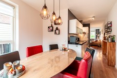 De open keuken is modern en praktisch ingedeeld, voorzien van diverse inbouwapparatuur en voldoende werk- en kastruimte. Vanuit de keuken loopt u direct door naar de eetkamer, een sfeervolle ruimte waar u gezellig met familie of vrienden kunt tafelen, terwijl u in contact blijft met zowel de keuken als de woonkamer.