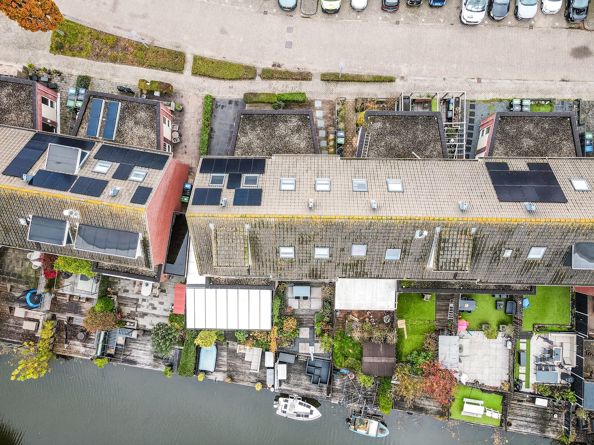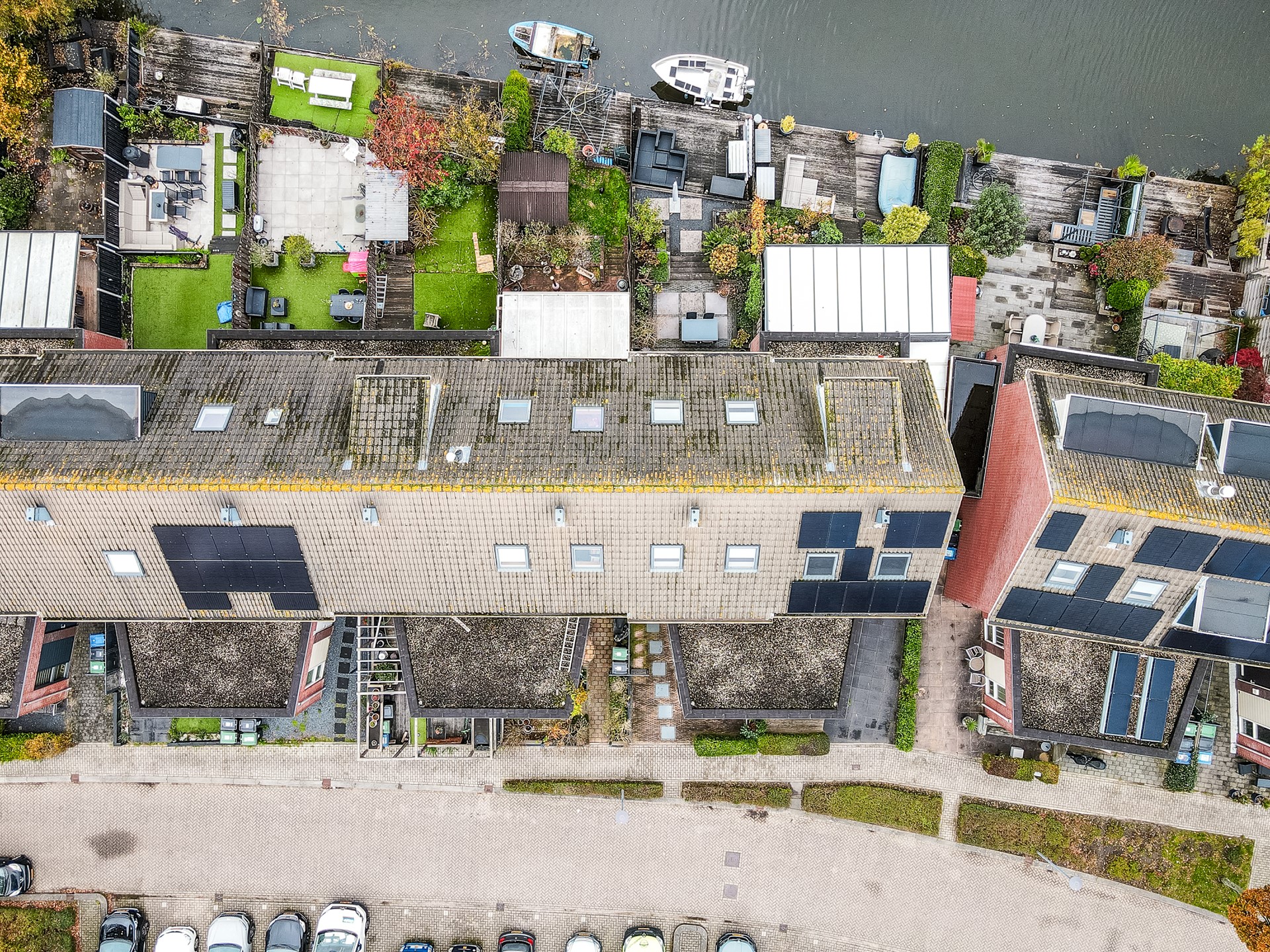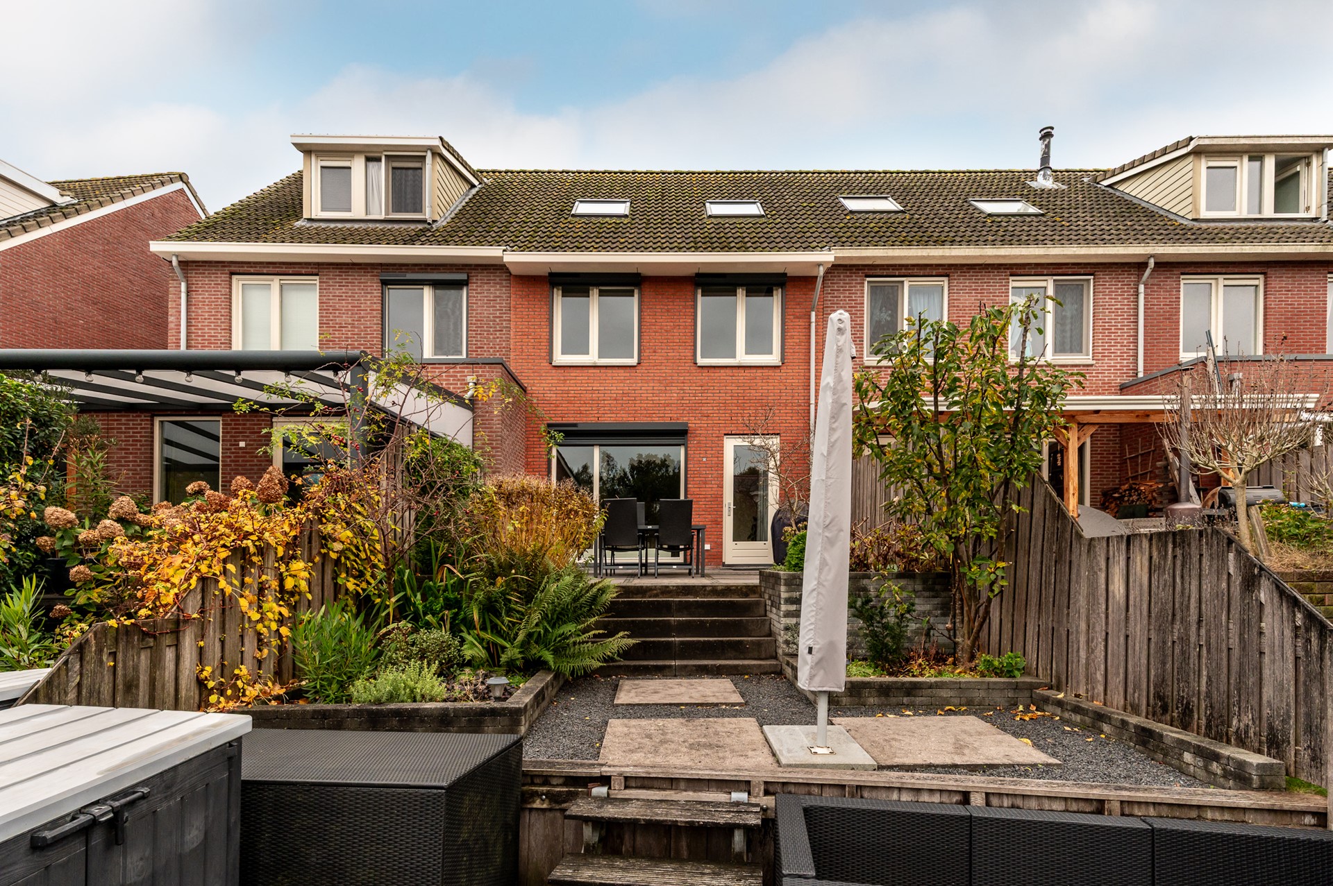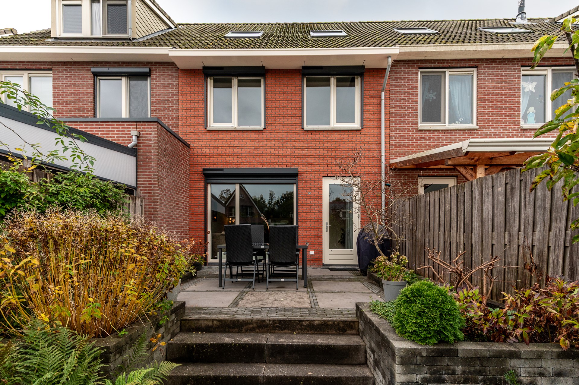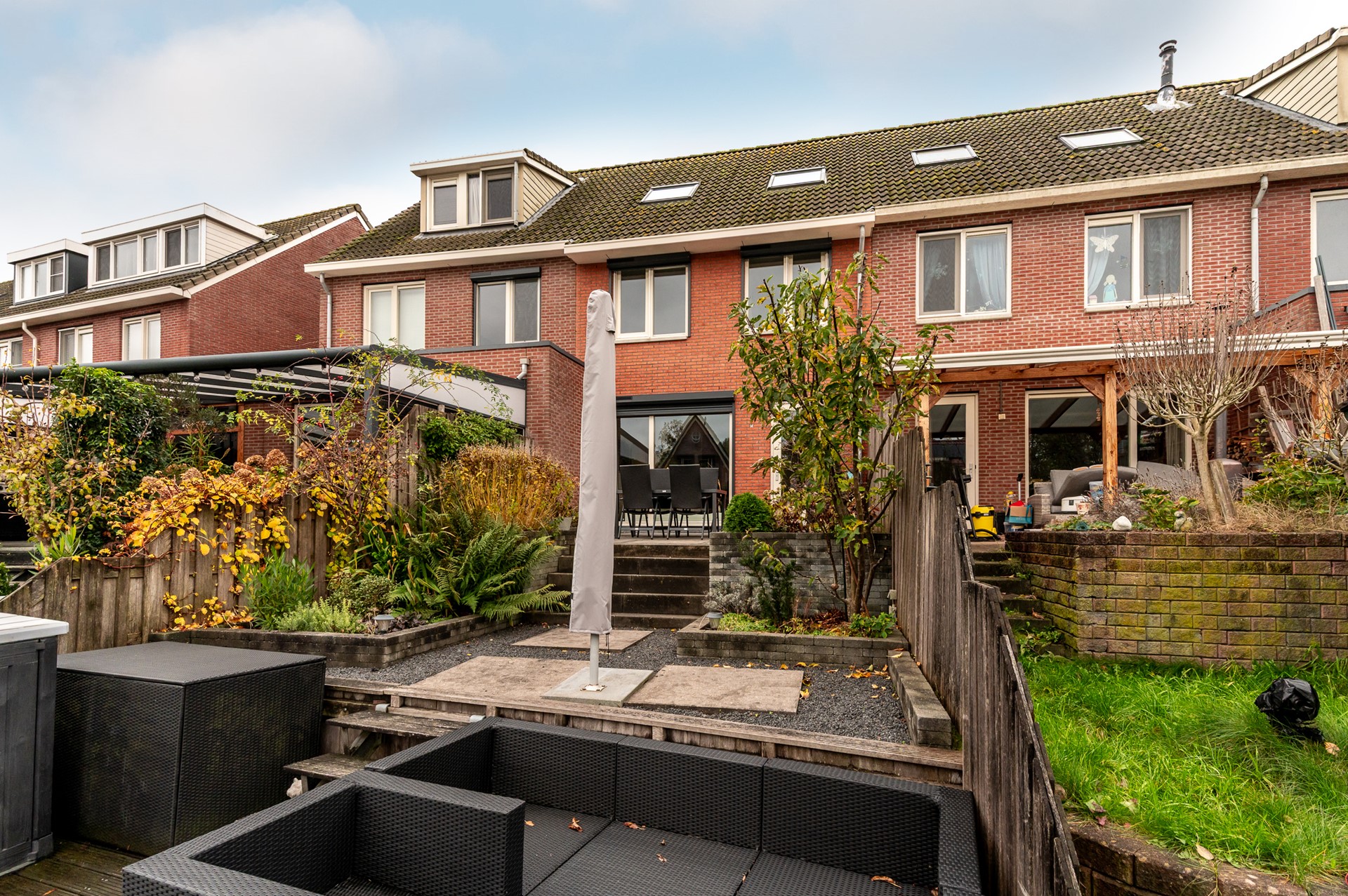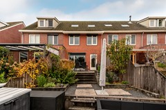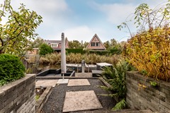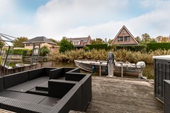 De achtertuin is fraai aangelegd en vormt een verlengstuk van de woonkamer. De tuin is splitlevel uitgevoerd, met drie niveaus die elk hun eigen sfeer bieden. Het bovenste terras grenst direct aan de woning en is ideaal voor een loungeset of eettafel. Via een trapje bereikt u de middelste laag, perfect als speelruimte of tweede zithoek. Helemaal onderaan ligt de steiger aan het water, waar u heerlijk kunt ontspannen of een bootje kunt aanleggen.