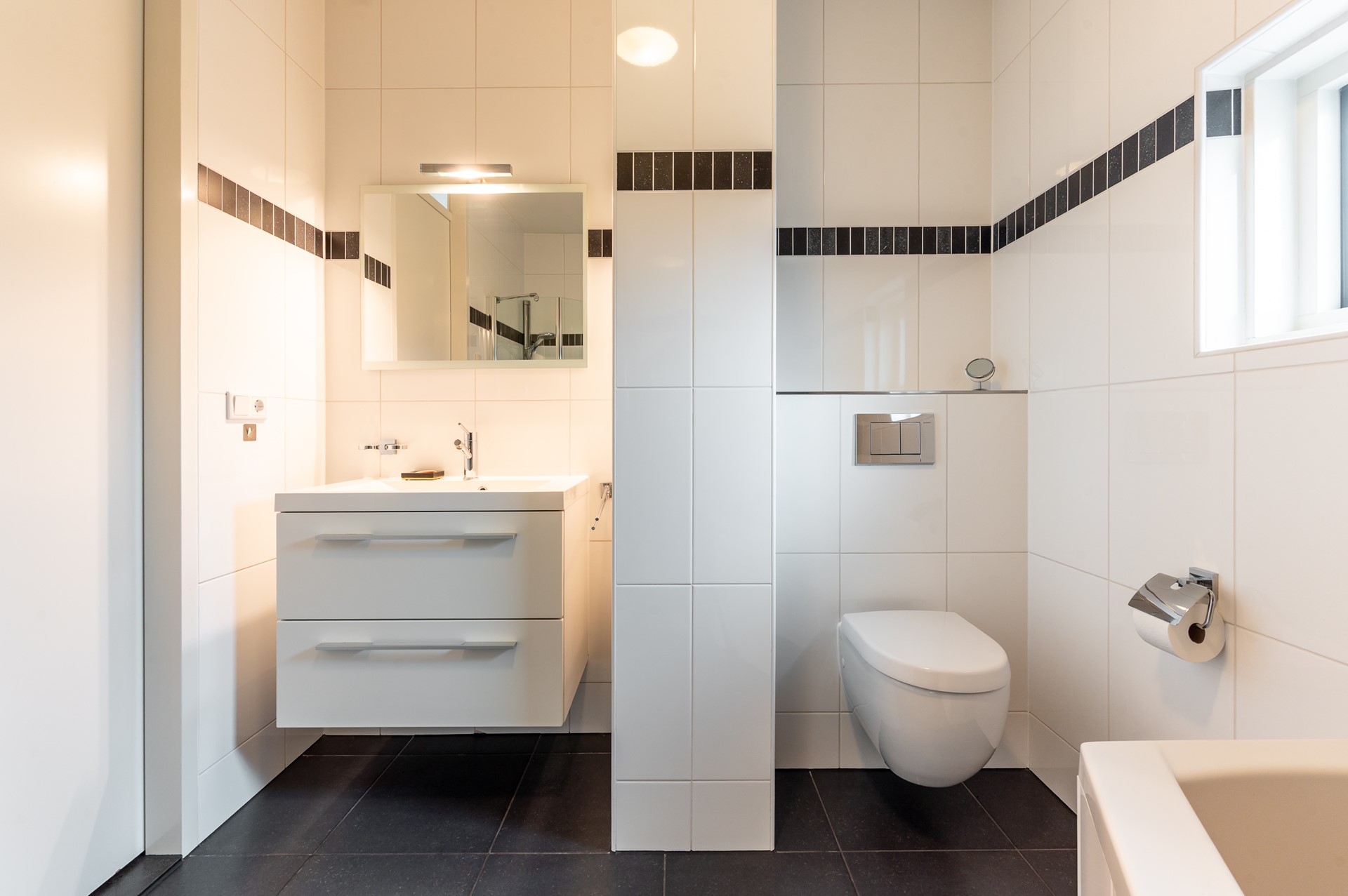 De eerste verdieping beschikt over drie slaapkamers, waarvan twee aan de achterzijde. Tussen deze kamers is een doorbraak gemaakt, waardoor een royale hoofdslaapkamer met inloopkast is ontstaan. De derde slaapkamer bevindt zich aan de voorzijde van de woning. De badkamer is compleet uitgevoerd met een wastafelmeubel, inloopdouche, ligbad en tweede toilet.