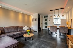 De voorgevel laat meteen zien dat dit een verzorgd en eigentijds huis is. Via de keurige hal met modern toilet (recent vernieuwd) kom je binnen in de woonkamer. Hier valt direct de hoogwaardige afwerking op:
