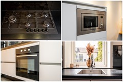 Onder de trap bevindt zich een praktische berging. Aan de voorzijde ligt de moderne keuken: een wit keukenblok met een stoer zwart werkblad, een groot 5-pits gasfornuis inclusief wokbrander, en natuurlijk alle benodigde inbouwapparatuur. Een heerlijke plek voor de kookliefhebber!