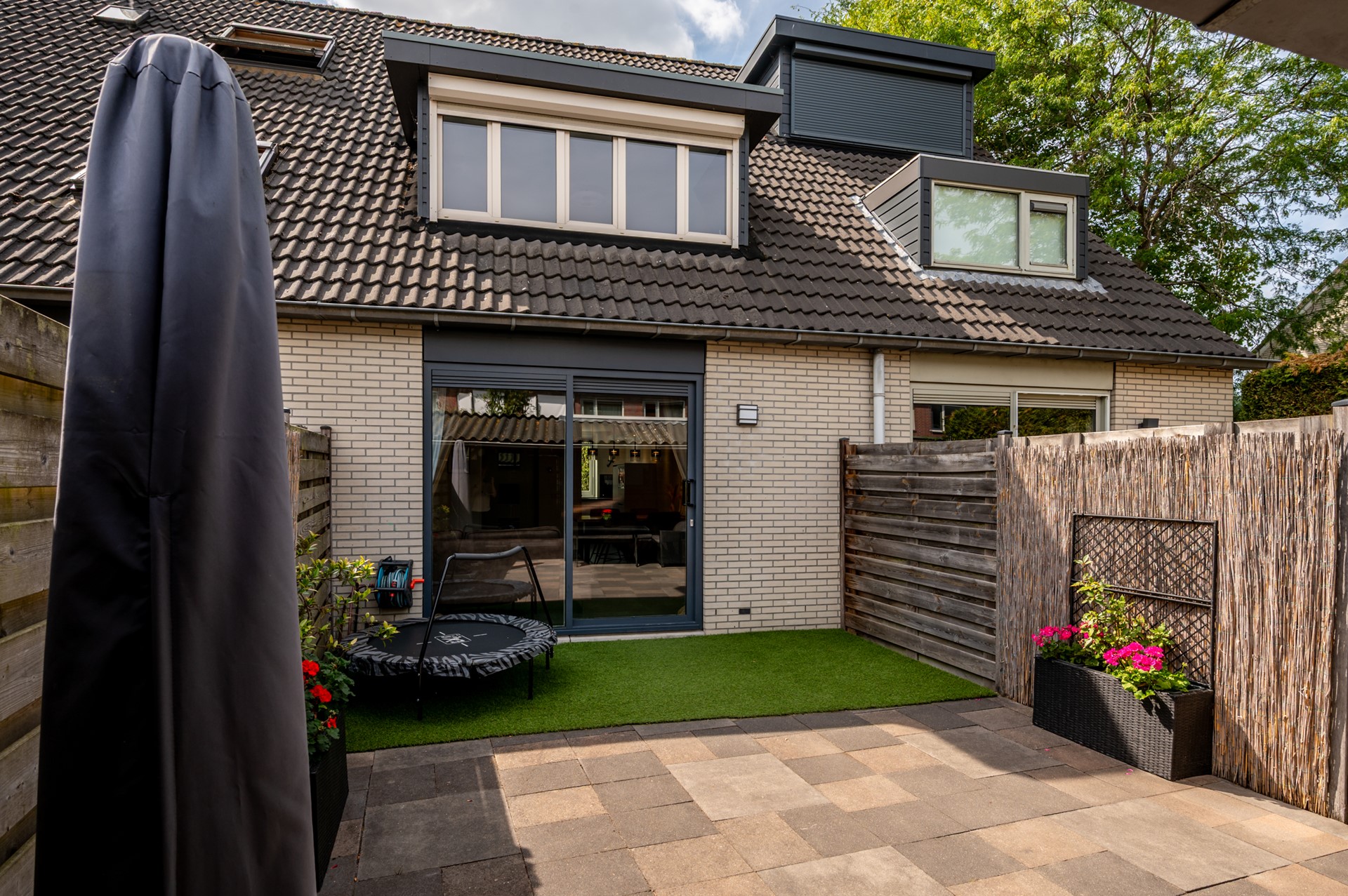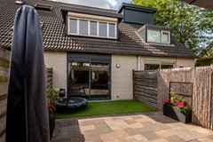 Ook buiten is de woning tot in de puntjes verzorgd. De achtertuin is volledig vernieuwd: opgehoogd, opnieuw betegeld en strak aangelegd. Dankzij de ligging op het noordoosten geniet je hier van fijne ochtend- en middagzon. Bovendien is er een houten berging met elektra, ideaal voor je fietsen of als extra klus-/opslagruimte. Uiteraard beschikt de tuin over een handige achterom.