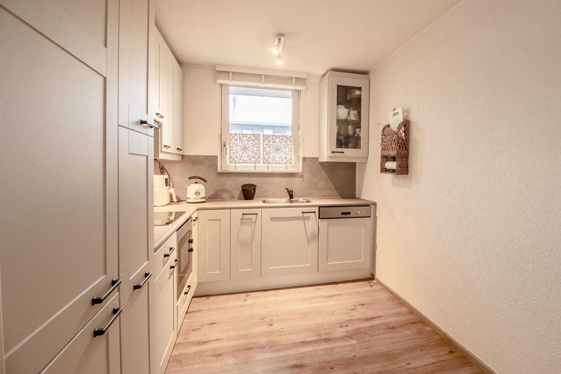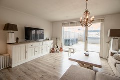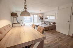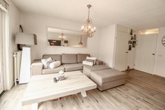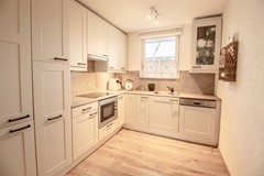 De woonkamer is royaal opgezet en dankzij de grote raampartijen aan de achterzijde baadt de ruimte in het daglicht. Deze brede glaspartij zorgt niet alleen voor een prachtige lichtinval, maar creëert ook een natuurlijke verbinding met de achtertuin. Binnen en buiten lopen hier moeiteloos in elkaar over, waardoor de tuin echt onderdeel wordt van uw leefruimte. Aan de voorzijde van de woning bevindt zich de keurig onderhouden keuken. Deze is praktisch ingericht en voorzien van diverse inbouwapparatuur, waardoor koken hier een plezier is. Vanuit de keuken kijkt u uit over de voortuin en de rustige straat, wat zorgt voor een prettige lichtinval en een open gevoel.