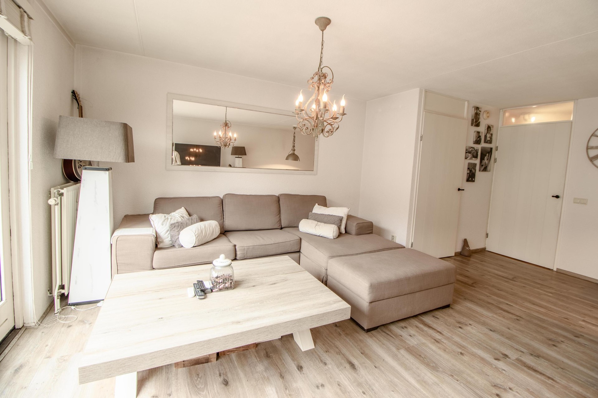 Via de hal komt u binnen in een verzorgde ontvangst met meterkast, modern toilet en de trapopgang naar de eerste verdieping. De hal geeft toegang tot de woonkamer, waar direct het ruimtelijke gevoel opvalt.