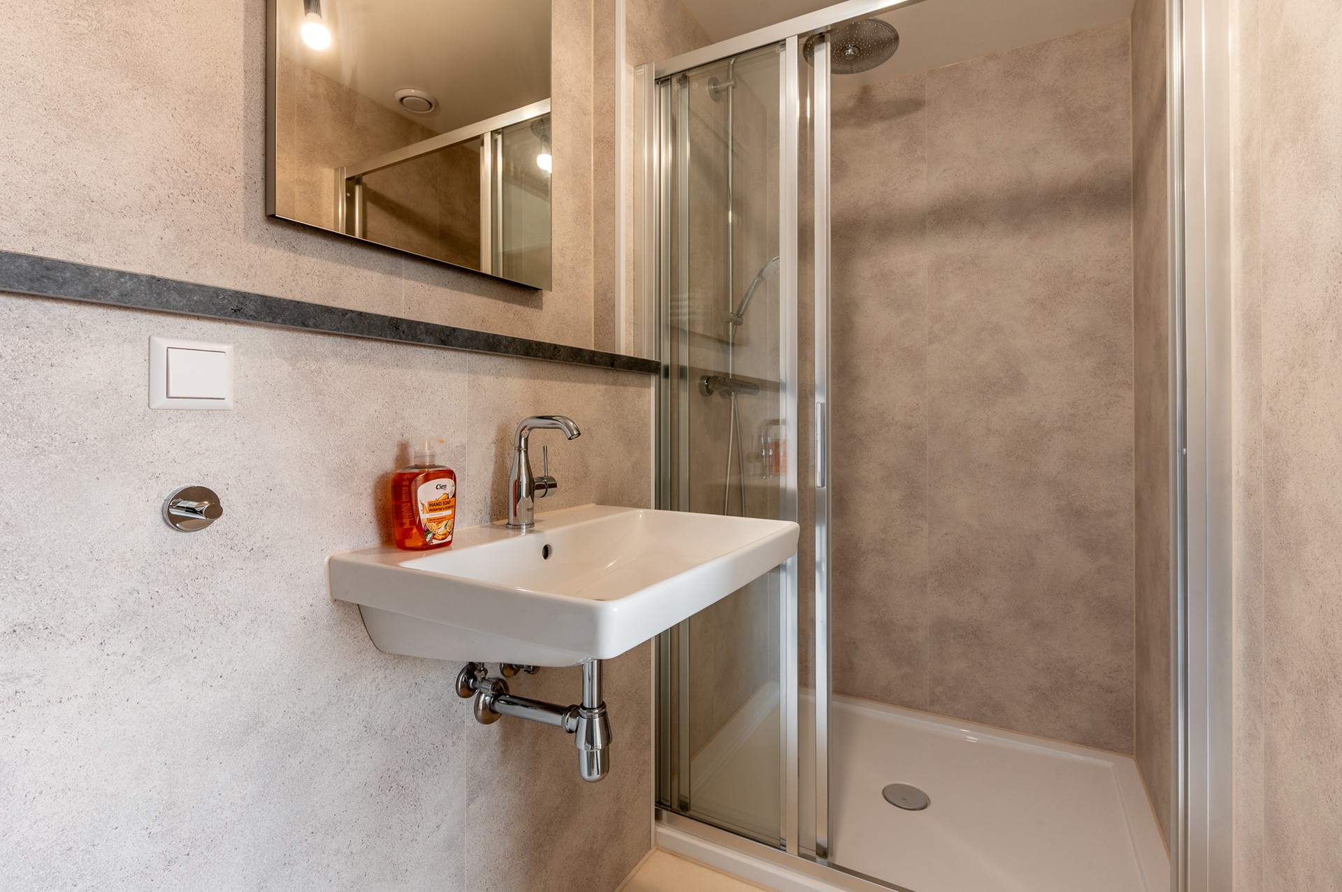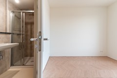 De woning beschikt over één comfortabele slaapkamer, welke direct grenst aan de badkamer. De badkamer is ensuite en compleet uitgevoerd met een douche, toilet en wastafel.