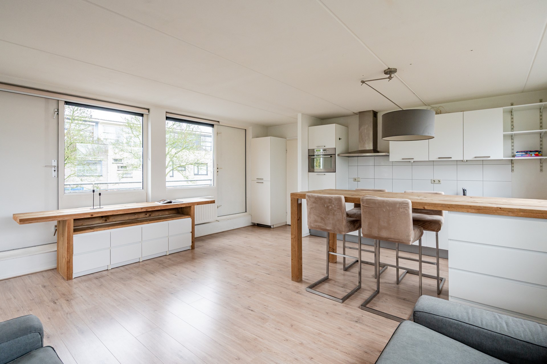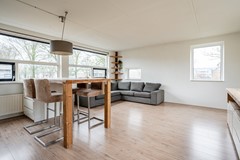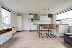 De woonkamer is ruim opgezet en afgewerkt met een nette laminaatvloer. Er is volop ruimte voor een royale eettafel, een comfortabele zithoek en een groot tv-meubel, zonder dat het geheel aan ruimte inboet. Vanuit de woonkamer geven twee deuren toegang tot het dakterras aan de straatzijde. Dit dakterras is gunstig gelegen op het oosten, waardoor je hier in de ochtend heerlijk van de zon kunt genieten. Een fijne plek om de dag rustig te beginnen met een kop koffie.