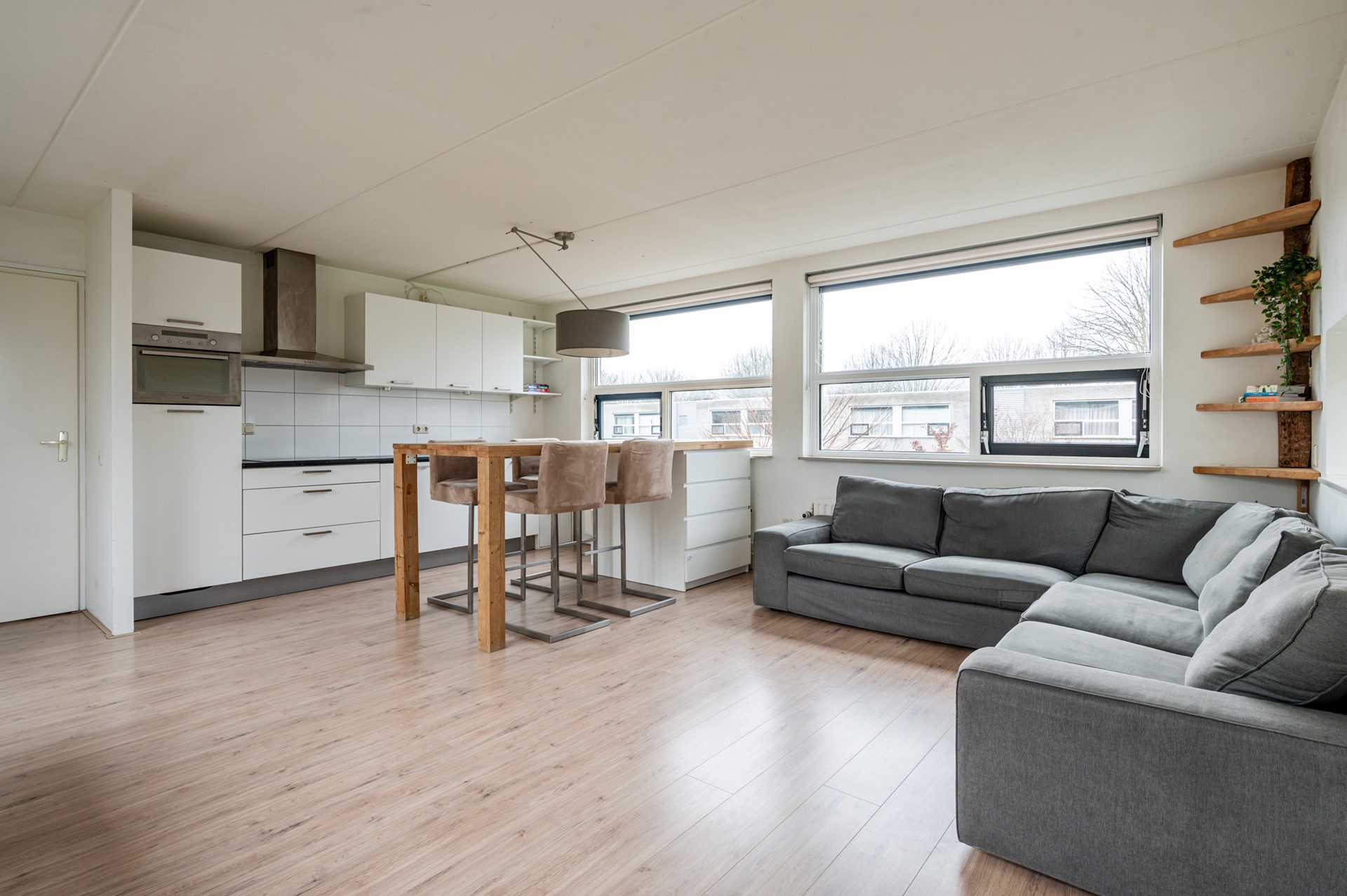 Via de centrale entree op de begane grond bereik je het appartement op de eerste verdieping. Bij binnenkomst kom je in de hal die toegang biedt tot de slaapkamer, de badkamer en de woonkamer. Zodra je de woonkamer binnenstapt, ervaar je direct de ruimte en vooral het prachtige licht. Dit betreft een hoekappartement met grote raampartijen aan de voor-, zij- en achterkant, waardoor het daglicht rijkelijk naar binnen stroomt. De lichtinval geeft de woning een open en aangename sfeer en biedt bovendien een leuk uitzicht de wijk in.
