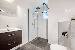 De badkamer is in 2024 geplaatst en modern afgewerkt. De ruimte is netjes betegeld en beschikt over een inloopdouche, een toilet, een wasmeubel, designradiator en een aansluiting voor de wasmachine. Alles is verzorgd en direct te gebruiken.