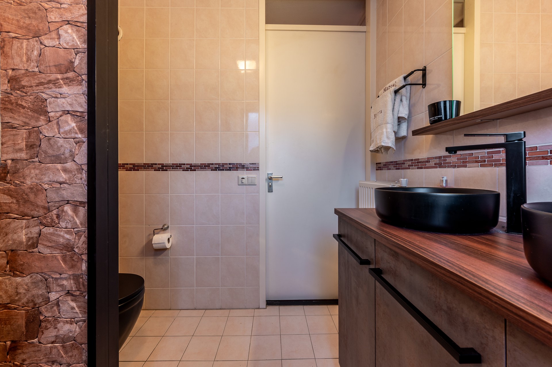 De badkamer, eveneens aan de voorzijde gelegen, is compleet uitgevoerd met een dubbele wastafel met meubel, toilet en een ruime inloopdouche.