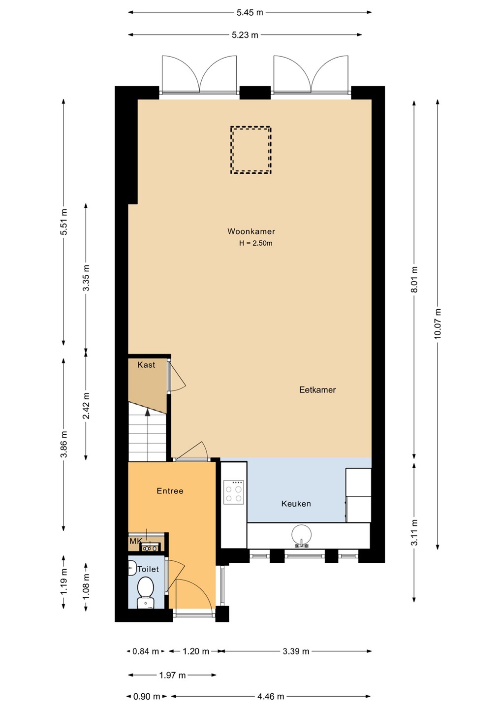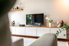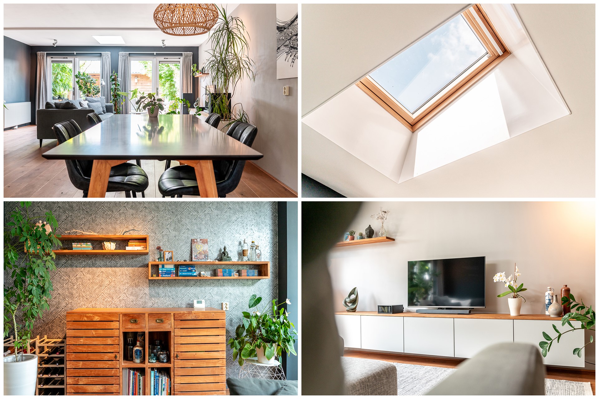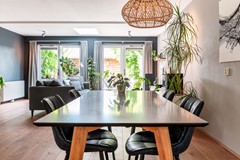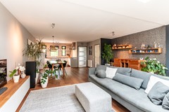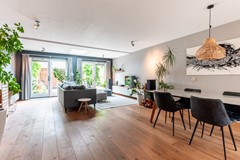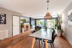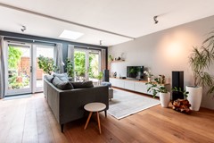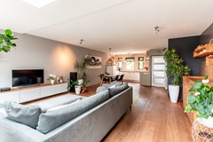 Bij binnenkomst tref je een lichte hal met meterkast, toilet en trapopgang naar boven. De ruime woonkamer is in 2009 uitgebouwd, wat zorgt voor een heerlijk royale leefruimte met volop indelingsmogelijkheden. Grote raampartijen en twee dubbele openslaande deuren naar de tuin zorgen voor veel daglicht. De vloer is prachtig en geeft een warm gevoel aan de "al" sfeervolle woning.