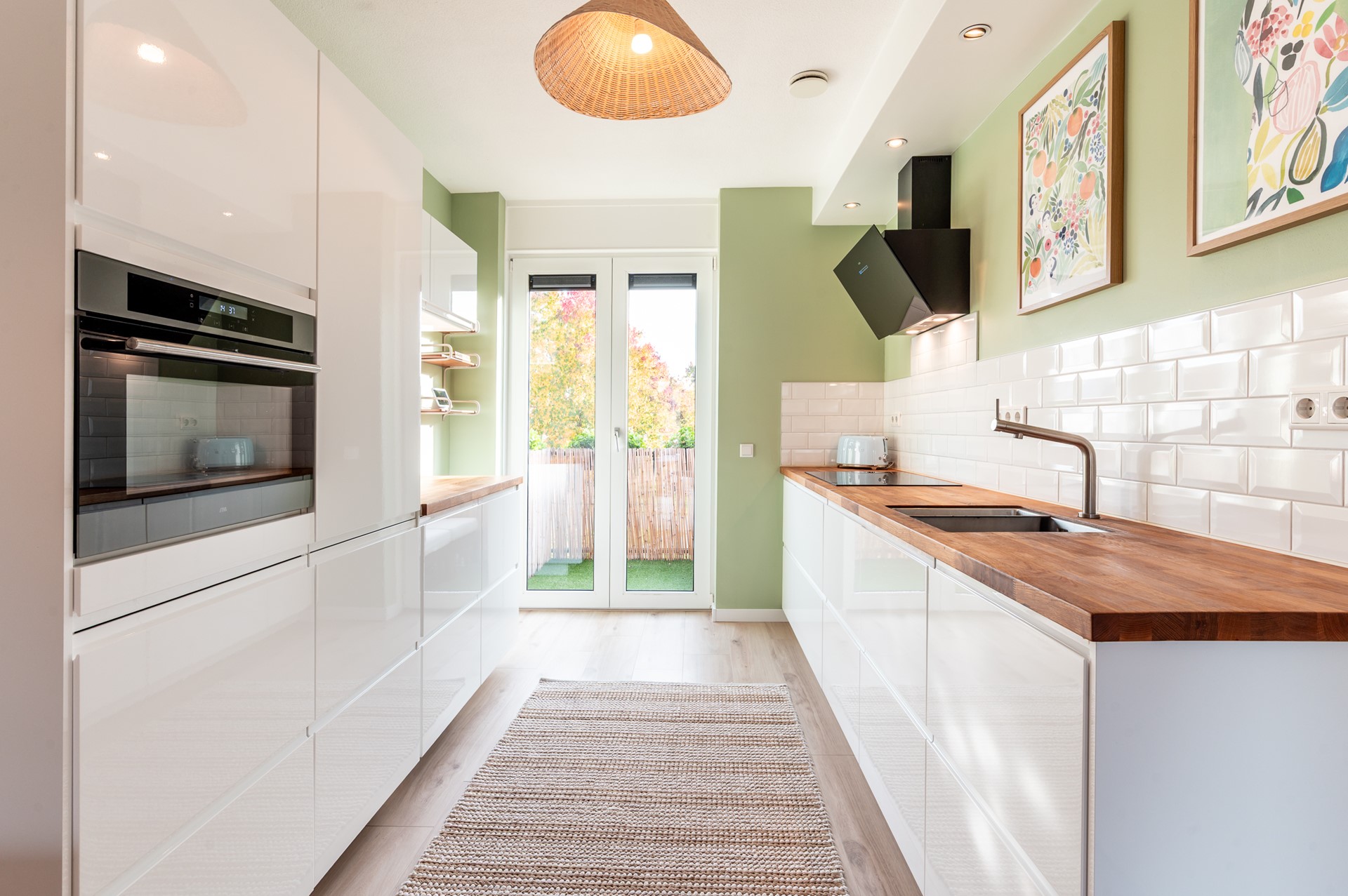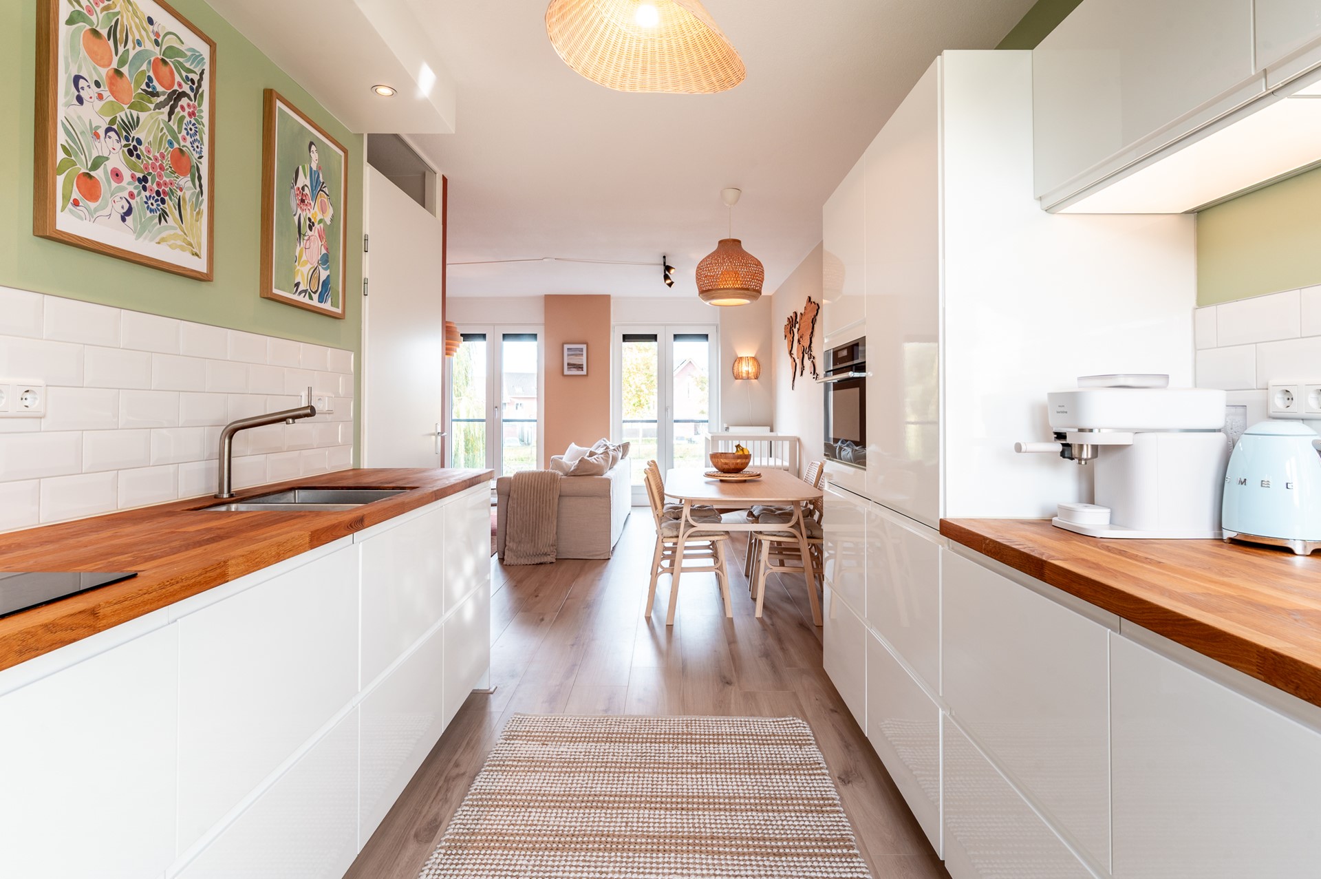 Aan de voorzijde bevindt zich de moderne, parallel geplaatste keuken, volledig uitgerust met inbouwapparatuur en met directe toegang tot het balkon. Een fijne plek om je dag te beginnen met een kop koffie of om ’s avonds nog even buiten te zitten. Verder vind je hier de overloop en een separaat toilet.