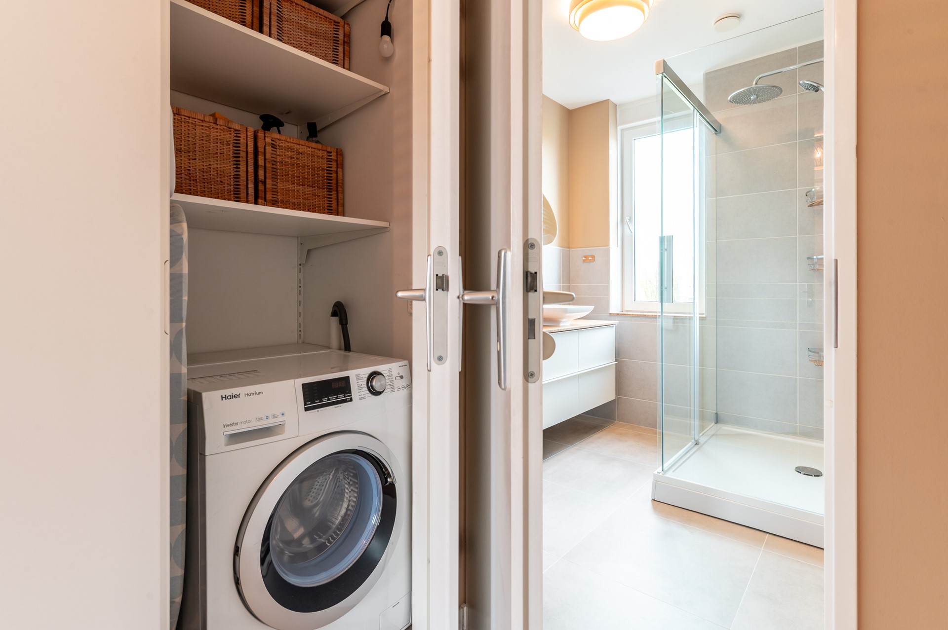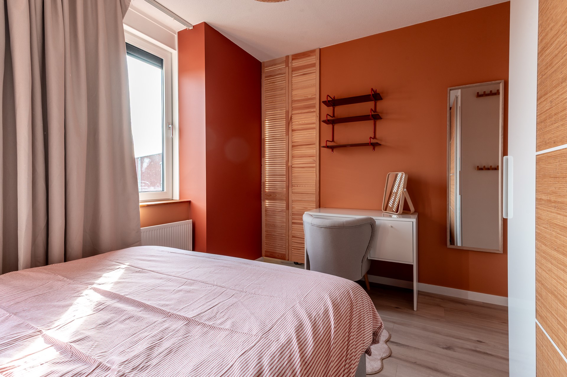 Op de bovenste verdieping bevinden zich twee goed bemeten slaapkamers, beide voorzien van praktische inbouwkasten. De badkamer is recent vernieuwd en sluit volledig aan bij de rest van het strakke en moderne interieur. De afwerking is tot in detail verzorgd, met gestucte wanden en een nette laminaatvloer die overal mooi doorloopt. Daarnaast is er een aparte bergkast waar ook de wasmachine geplaatst kan worden.