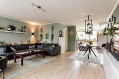U betreedt de woning via de hal met toilet, meterkast en trapopgang naar de eerste verdieping. De lichte, tuingerichte woonkamer biedt via een schuifpui toegang tot de fraai aangelegde achtertuin met een ruime overkapping direct aan de woning, perfect om het hele jaar door buiten te genieten.