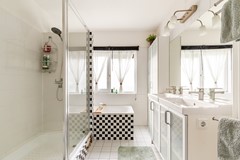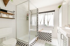 De overloop biedt toegang tot drie ruime slaapkamers, twee aan de achterzijde en één aan de voorzijde. De badkamer is keurig betegeld en voorzien van een ligbad, aparte douche, wastafel met meubel, tweede toilet en een raam voor natuurlijke ventilatie.