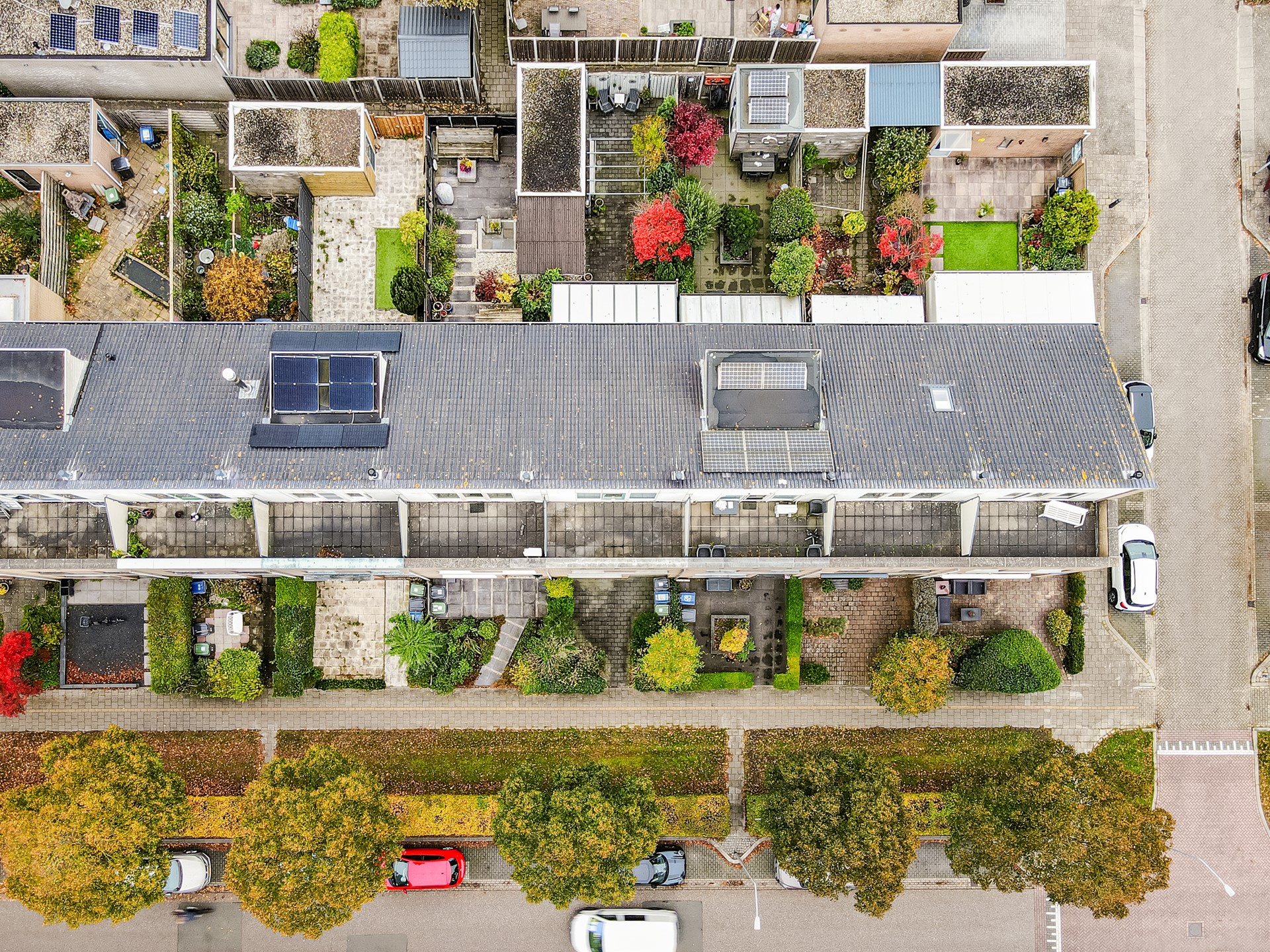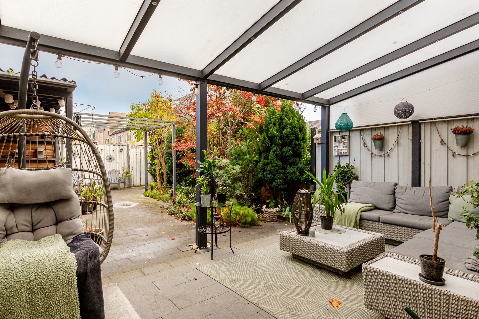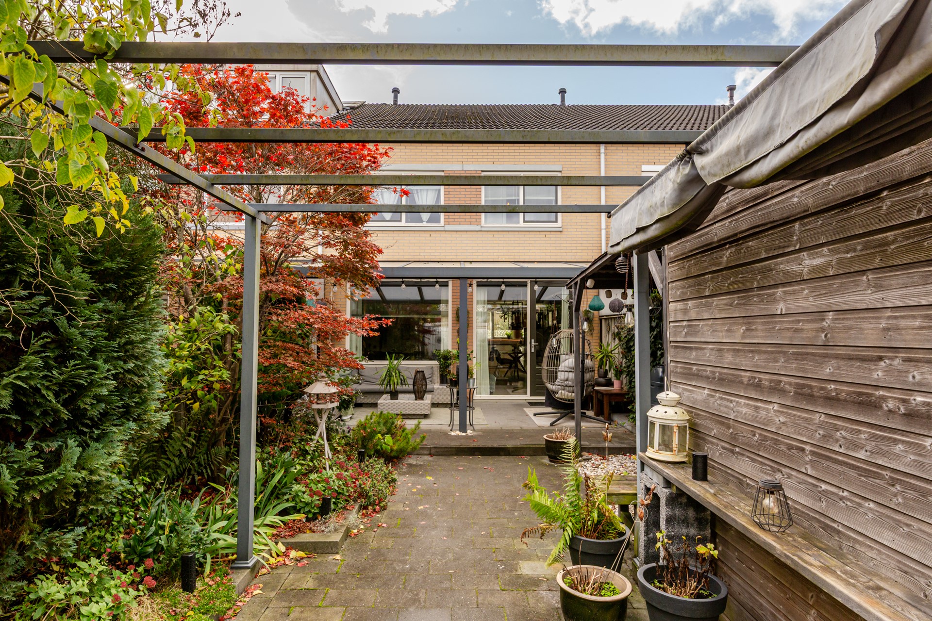 De achtertuin is fraai aangelegd en beschikt over een ruime overkapping direct aan de woning, waardoor u hier in elk seizoen comfortabel buiten kunt zitten. De houten berging biedt praktische opbergruimte voor fietsen en tuingereedschap, en via de achterom is de tuin ook vanaf de achterzijde bereikbaar.