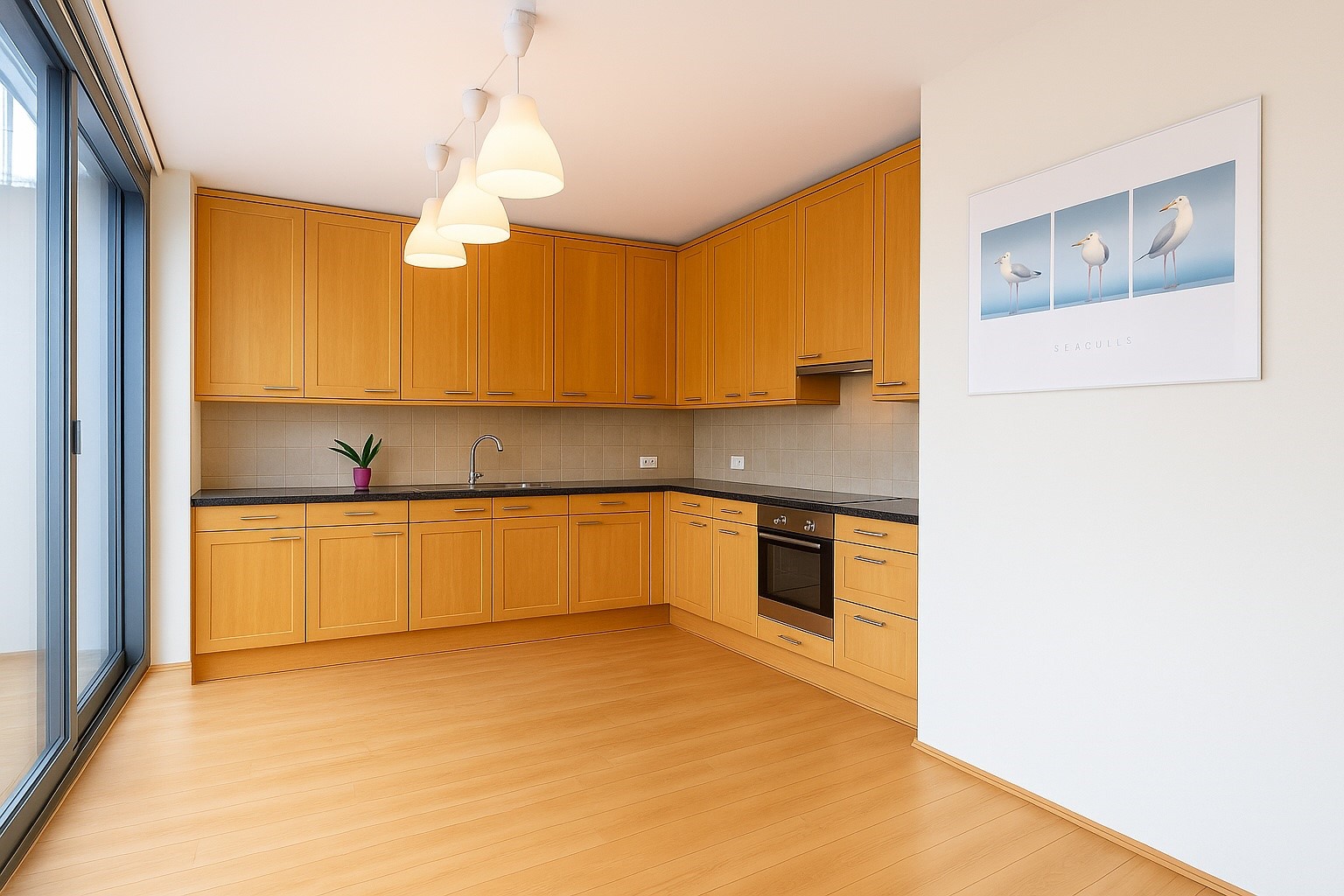 Aan de linkerzijde vind je de keuken, die in open verbinding staat met de royale woonkamer aan de achterzijde. Het zitgedeelte is opvallend licht dankzij de speelse verdeling in plafondhoogte, wat zorgt voor extra lichtinval én een ruimtelijk gevoel.