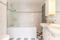 De badkamer is centraal gelegen en voorzien van een ligbad, toilet en een dubbele wastafel. Ook de overloop is verrassend licht dankzij een nette lichtkoepel.