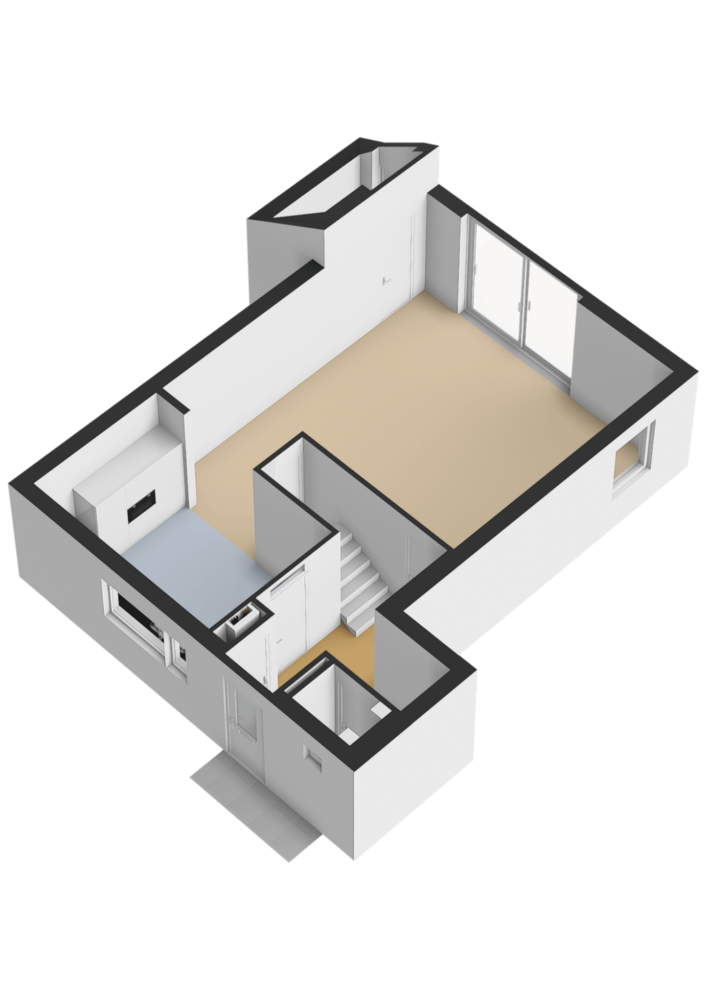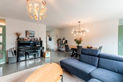 Vanuit de keuken bereikt u de lichte en royale woonkamer, waar de grote raampartijen en de brede schuifpui meteen voor een open, frisse sfeer zorgen. Dankzij de zonnige ligging op het zuiden stroomt het daglicht hier de hele dag binnen. Aangrenzend vindt u nog een handige ruimte, ideaal als bijkeuken, extra berging of werkplek. De biopolymeer vloer op de gehele begane grond geeft het geheel een moderne, strakke uitstraling en zorgt voor eenheid in de leefruimte.
