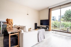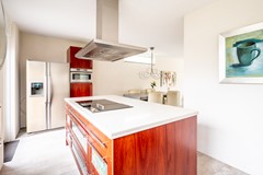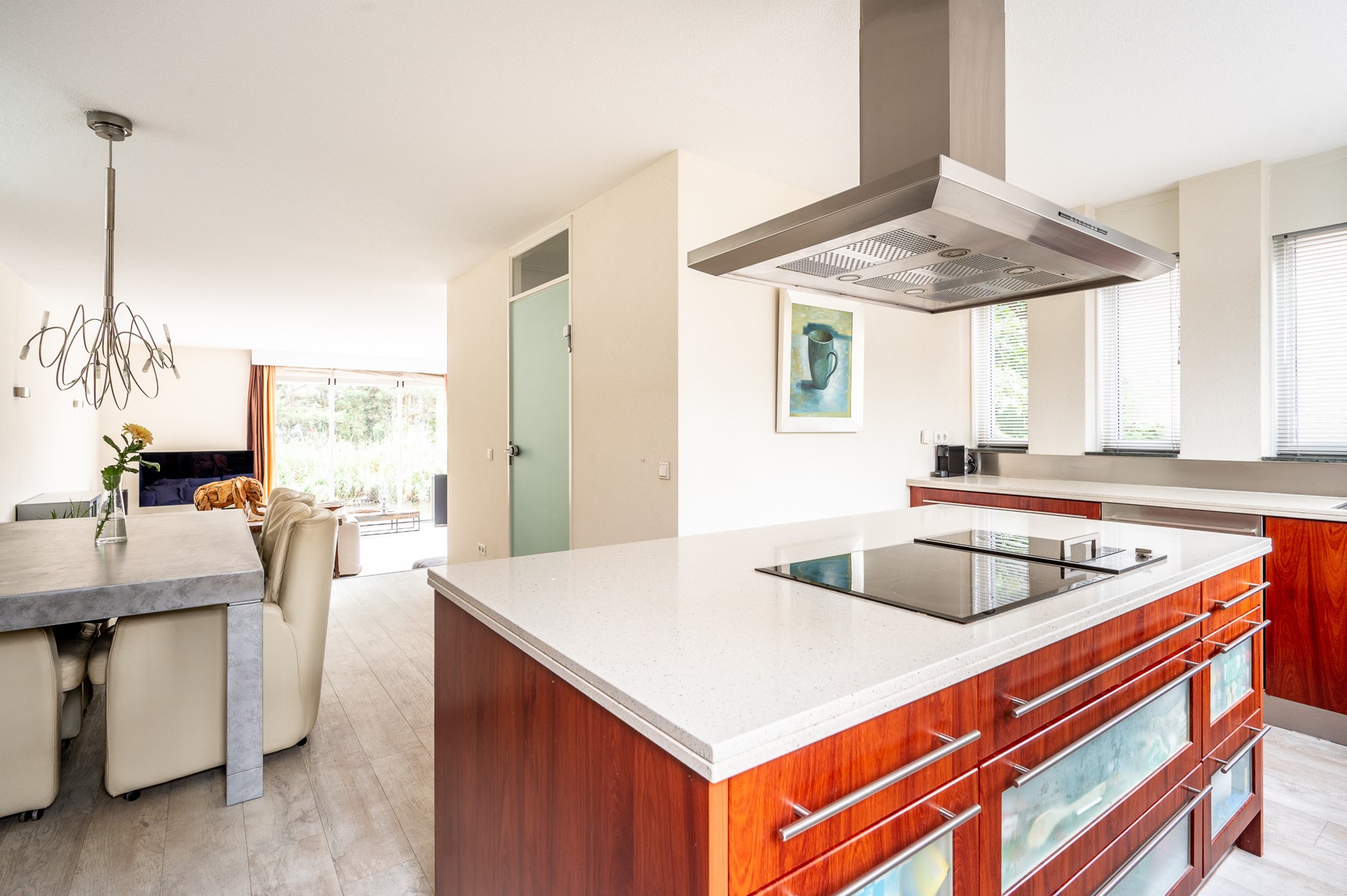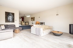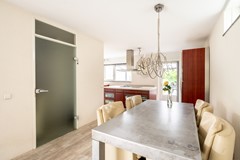Het zitgedeelte is speels verlaagd en hierdoor voorzien van extra hoge plafonds. De schuifpui zorgt ervoor dat binnen en buiten naadloos in elkaar overlopen. Dit maakt het een unieke plek waar je altijd geniet van licht en ruimte. Tussen het zitgedeelte en de keuken bevindt zich een heerlijke plek waar gezelligheid samen komt middels een riante eetkamertafel.