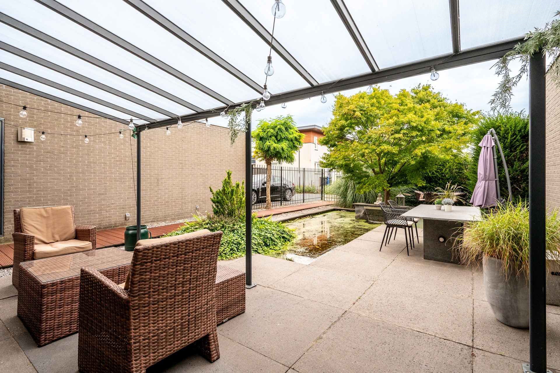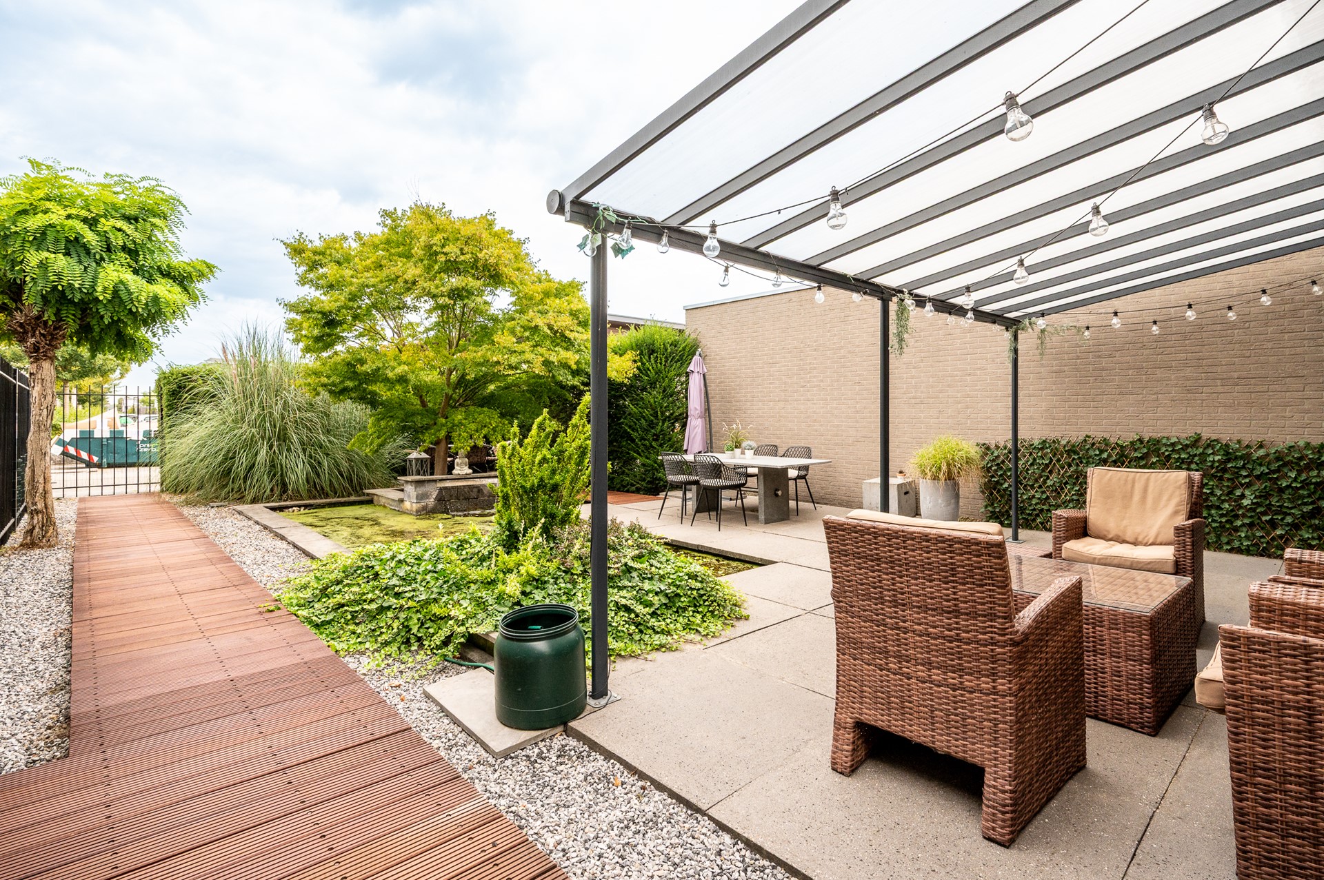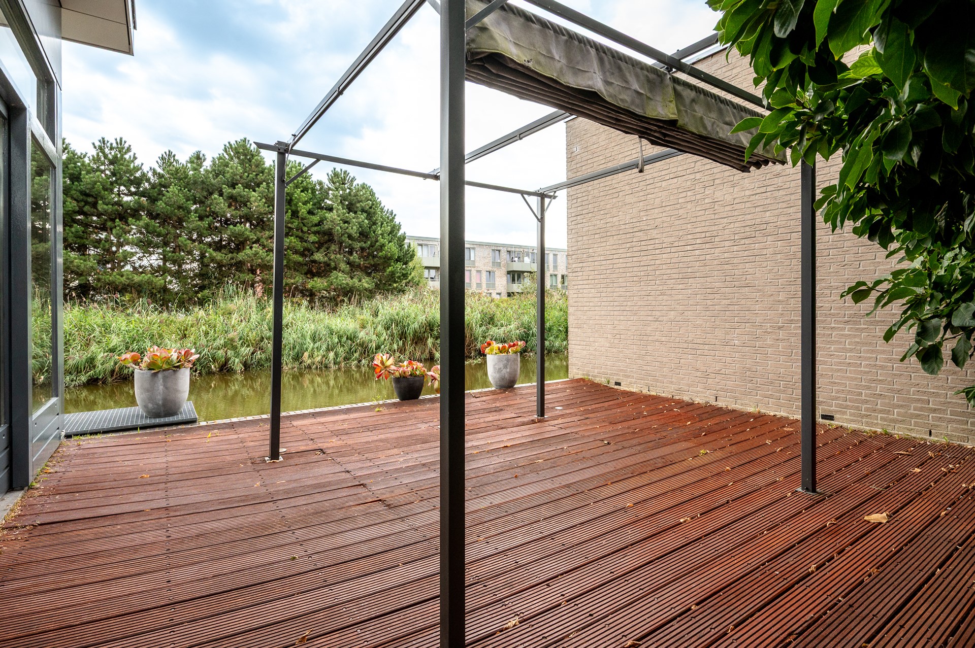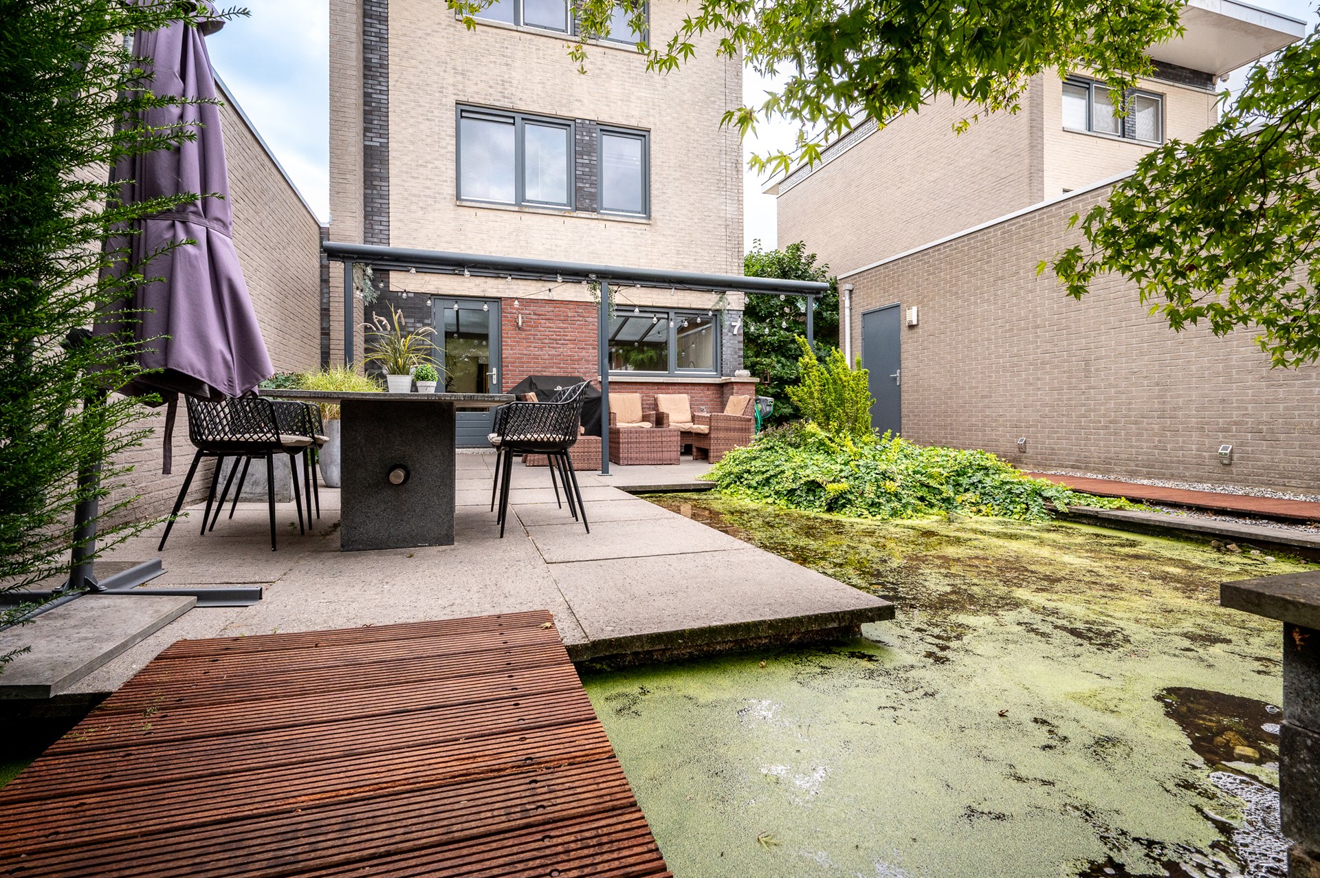 De tuin is fraai aangelegd met een veranda, mooie bestrating, een groenaccent én een vijver. De ligging aan het water geeft je volop rust: via de zijtuin loop je zo naar de houten vlonder, waar je heerlijk geniet van het kabbelende water en het rustgevende uitzicht.
