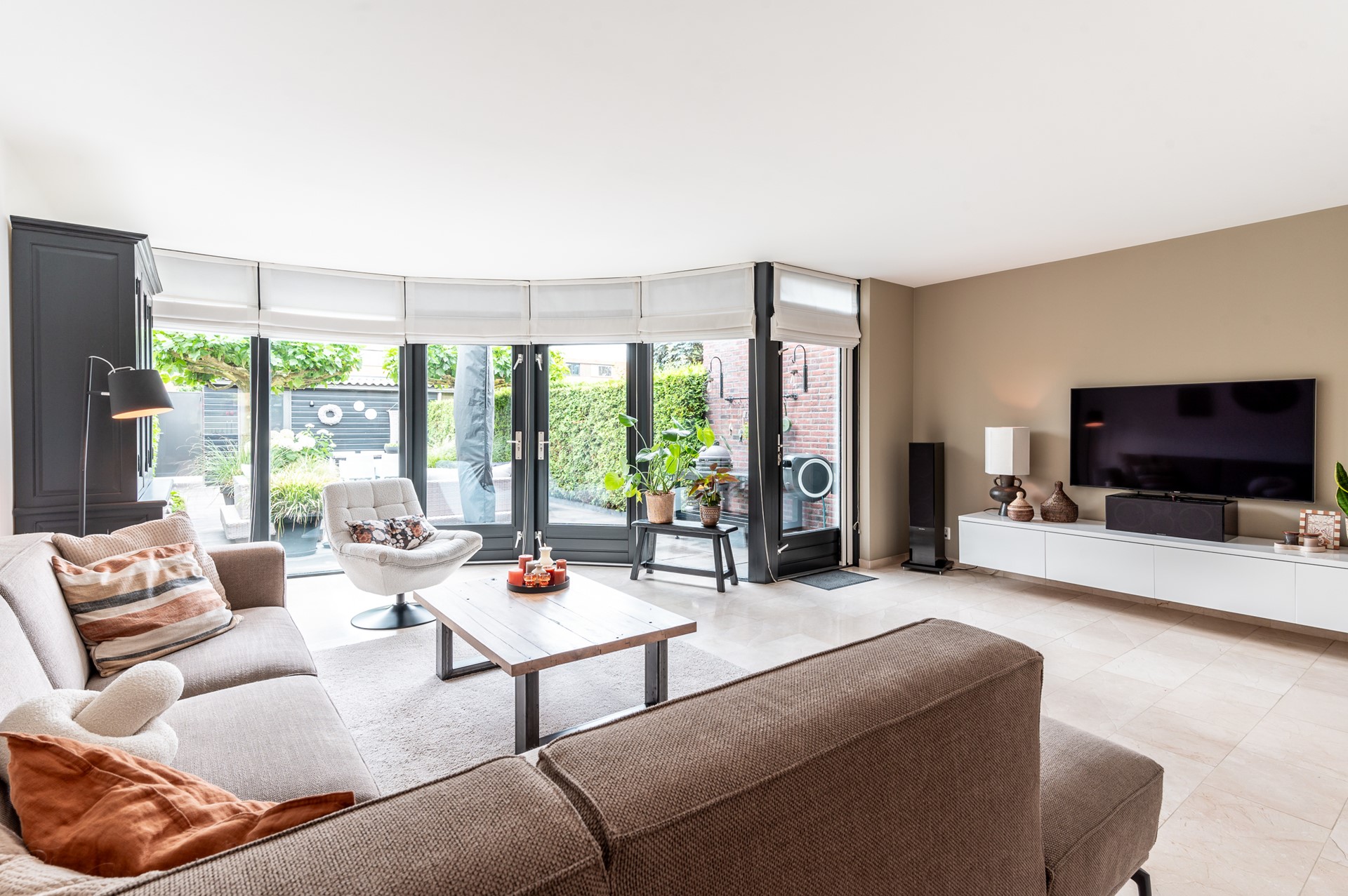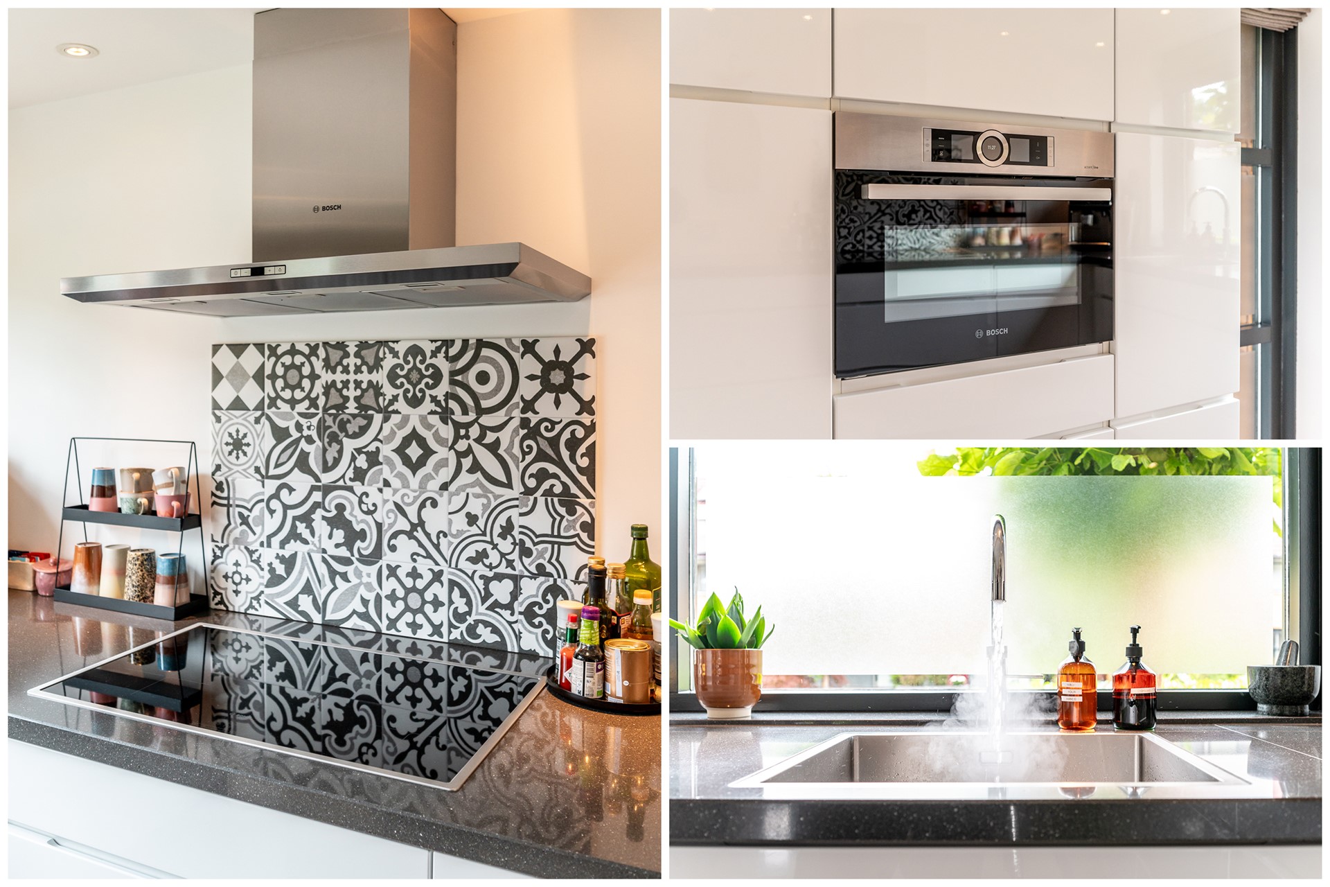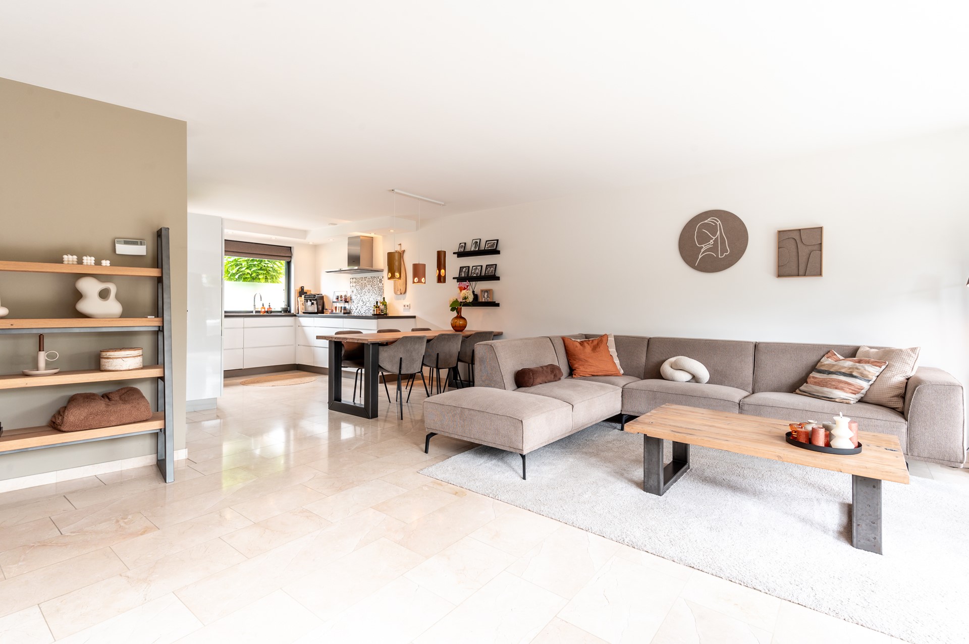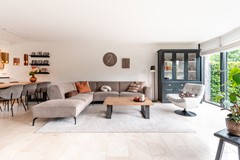 De witte keuken aan de voorzijde is strak, modern en van alle gemakken voorzien. Denk aan een quooker, extra diepe lades, veel werkruimte en een tijdloze uitstraling. De keuken loopt naadloos over in de ruime en lichte woonkamer, met aan de achterzijde een speelse halve erker. Die zorgt voor nog meer lichtinval en een prettige zithoek.