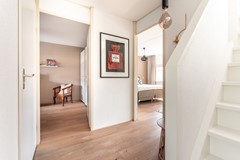 Je komt binnen in de verzorgde hal met een modern toilet en een praktische trapkast/berging onder de trap. Vanuit hier neem je de trap naar boven, naar de eerste verdieping. Door de raampartijen die vanuit de hal doorlopen tot boven komt er bijzonder veel daglicht naar binnen. De gehele verdieping is voorzien van een luxe marmervloer met vloerverwarming, die zorgt voor een comfortabele en stijlvolle basis.